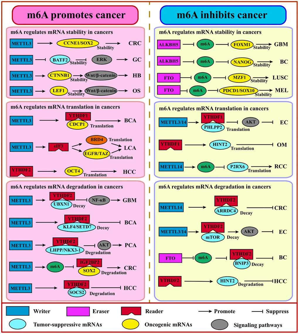 Growing studies revealed that the global abundance of m6A and expression level of m6A regulators often show aberrance across various cancers and are associated with cancer initiation, progression, metastasis, relapse, and therapy [48–50]. Human HCC showed a higher abundance of m6A and augmented gene expression levels when YTHDC2 was knocked down, whereas the global abundance of m6A was reduced significantly in human bladder cancer [51]. This contradiction suggests that research on m6A needs to be more detailed and context dependent. Thus, a comprehensive understanding of m6A regulators may account for better prevention and treatment (Figure 3, Table 2).