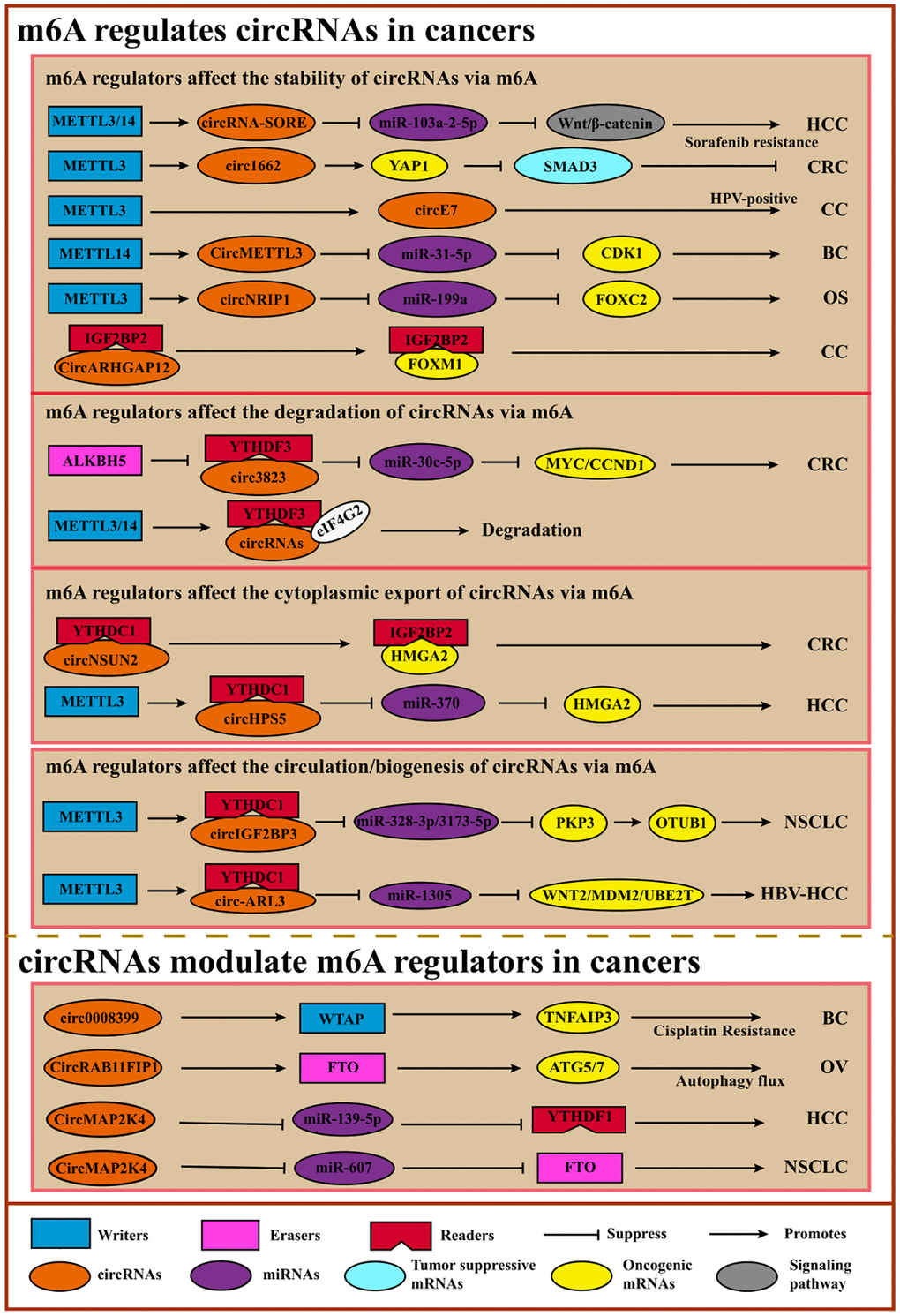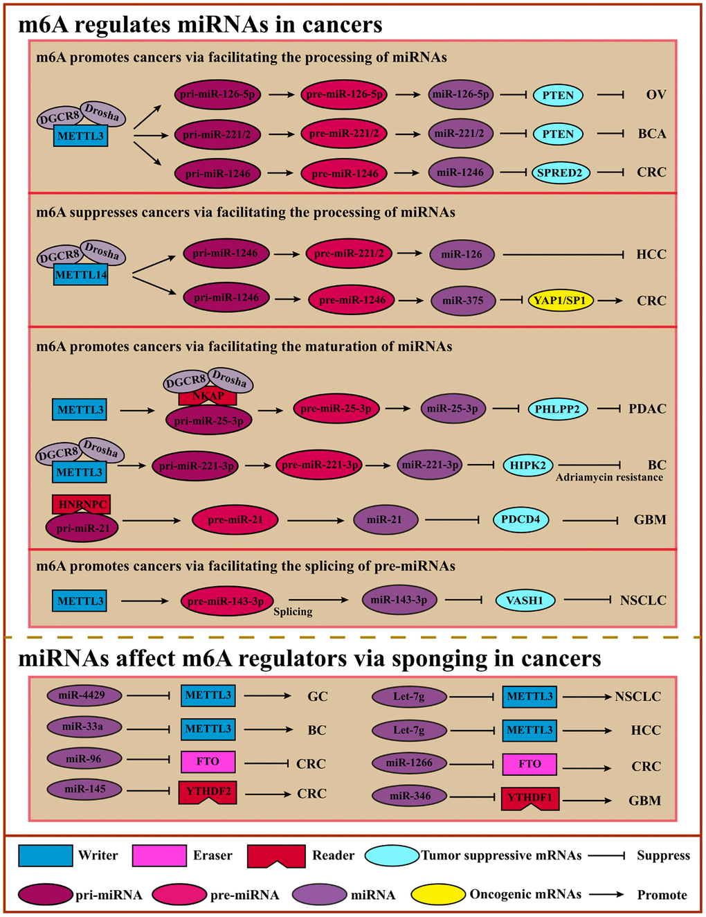 This review will summarize the physiological function of m6A or m6A regulators and focus on the interplay of m6A and protein-coding RNA, and ncRNAs (miRNA, circRNA, lncRNA) in various cancers. Finally, we will list the experimental detection and prediction methods of m6A modification residues and summarize m6A-related databases.