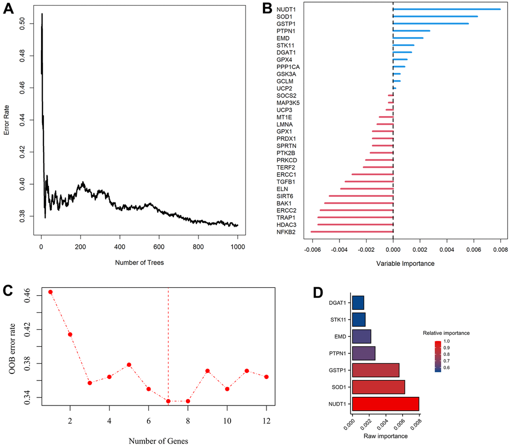 According to the median value of gene expression, univariate COX analysis was carried out to select ARGs with prognostic values in the training set (Supplementary Table 2). A total of 48 ARGs were associated with AML prognosis (Supplementary Table 3, P<0.05), with 35 of adverse prognostic ARGs and 13 of favorable prognostic ARGs. Thirty-two of 35 adverse prognostic ARGs were chosen as candidate genes, which were co-expressed in GSE37642 cohort. The importance of 32 ARGs was ranked using a model of random survival forest (ntree=1000, “randomForestSRC” R package) [20]. To choose the optimal model for constructing prognostic signature, 12 of 32 ARGs with a positive raw importance were chosen and screened using method of weighted random forest (“Ranger”, “randomForest” and “survival” R packages). Finally, seven-ARGs signature was identified with a lowest out of bag (OOB) error rate in the training set, and seven ARGs with a relative importance greater than 0.52 were transferred to further assessment using by COX regression model. The expression level and COX regression coefficient of ARGs were used to calculate the prognostic risk score (PRS) as below: