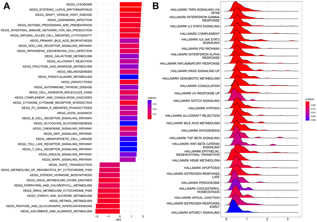 GSEA analysis of KEGG connoted that HRPS-group was enriched in many pathways, such as signaling of WNT, Toll-like receptor and MAPK. Similarly, many items of immune pathways were also enriched in HRPS-group (processing and presentation of antigen, interaction of cytokine and cytokine receptor, signaling pathway of Chemokine and T cell receptor) (Figure 3A).