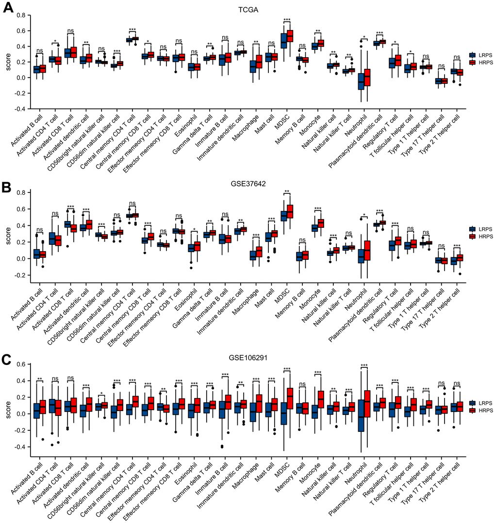 Differences of immune-related characteristics were analyzed between the HRPS- and LRPS-group, adopting R package of ESTIMATE for calculating stromal-score, immune-related score, purity of tumor, and ESTIMATE-related score [52]. Meanwhile, using R packages of GSVA and GSEABase, ssGSEA was performed to quantify different types of immune-related cells. The immune-related gene sets were collected from previous studies (Supplementary Tables 4, 5) [53, 54]. To further identify the potential therapeutic targets of checkpoints for ARGs signature, we also evaluated the correlations of PRS with the expressed levels of 8 immune-related checkpoints (HAVCR2, SIGLEC15, PDCD1, PDCD1LG2, CD274, LAG3, CTLA4 and TIGIT).