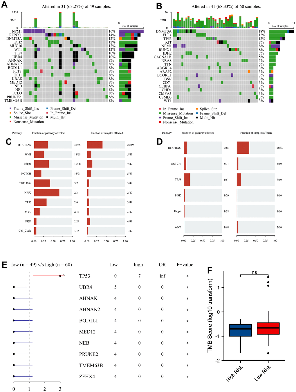 The top 20 frequent genes of mutation were visualized in Figure 5. NPM1 was the primary mutated gene in LRPS-group (Figure 5A), whereas TP53, KIT and FLT3 mutated frequently in HRPS-group (Figure 5B). The results of Oncogenic Signaling Pathways revealed that LRPS-group displayed a higher frequency of mutations, which were enriched in many different pathways, including NRF2, TGF-β, Hippo, MYC, PI3K and Cell Cycle (Figure 5C). In HRPS group, TP53 followed by RAS and NOTCH pathways were the most mutation-enriched pathways (Figure 5D). Forest plot confirmed that HRPS-group occurred more frequent TP53 mutation (Figure 5E). However, no difference of TMB was found between these two groups (Figure 5F). PRS distributions showed that more patients with higher PRS were assigned to FLT3-TKD mutation (Supplementary Figure 7A), but those with lower PRS were more likely to appear in mutations of double CEBPA and IDH2 (Supplementary Figure 7B, 7C). However, no differences of PRS distribution were found between patients with wild type and mutations of FLT3-ITD, NPM1, IDH1, KRAS, and NRAS (Supplementary Figure 7D–7H). These results implied that HRPS-group was highly associated with the driver gene and signaling pathway of TP53.