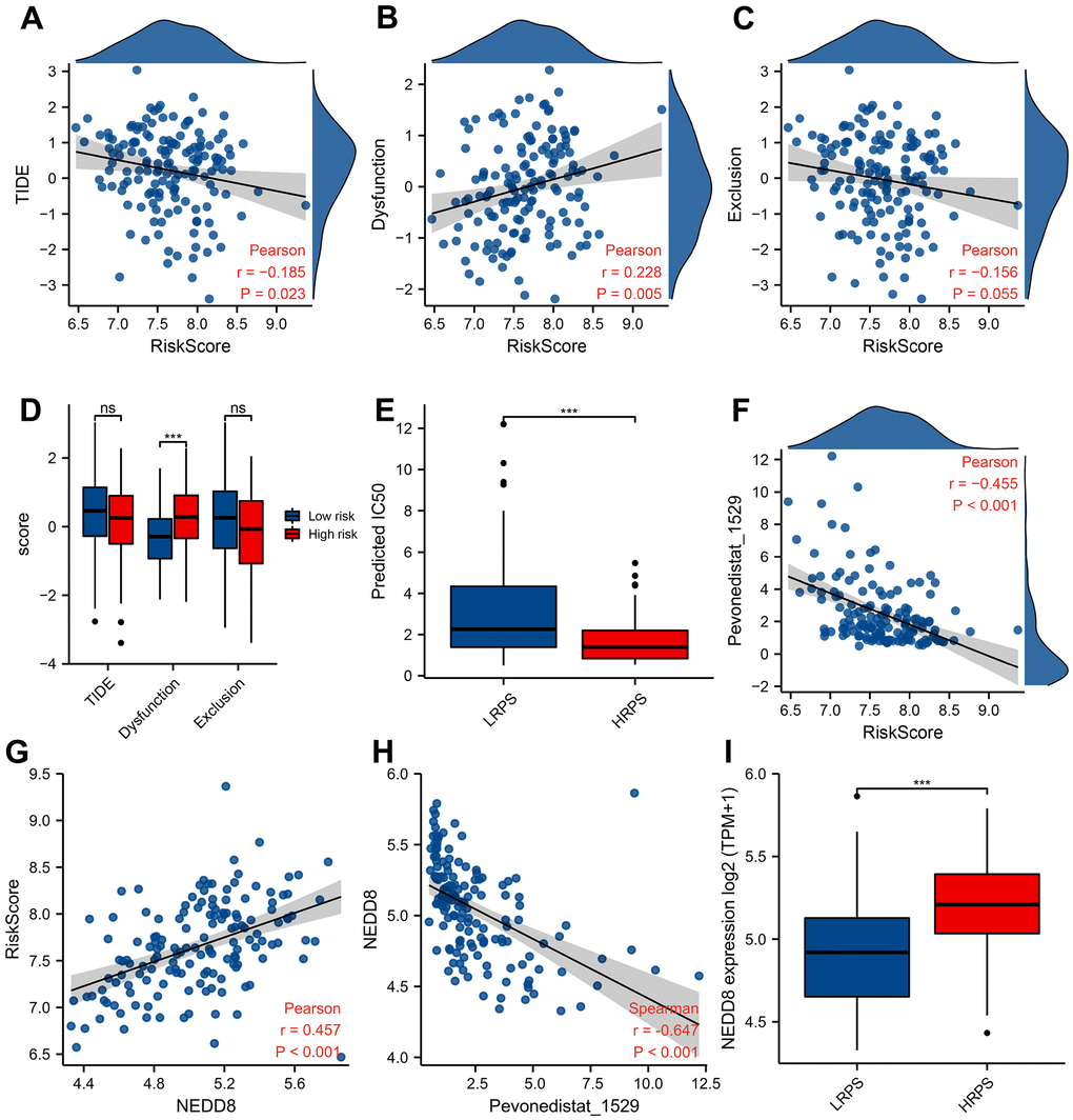 Pevonedistat is an inhibitor of NEDD8-activating enzyme, the response of which is significantly correlated with expression level of NEDD8. To reveal the relationship between 7-ARGs signature and NEDD8 expression level, Figure 6G demonstrated that NEDD8 expression is positively related with PRS (R=0.457), and negatively (Figure 6H, R= -0.647) related with the predicted IC50 of Pevonedistat (P<0.001). Moreover, HRPS-group also had a higher NEDD8 expression than LRPS-group (Figure 6I, P<0.001). These results suggested that Pevonedistat may be a potential drug for the HRPS-group.