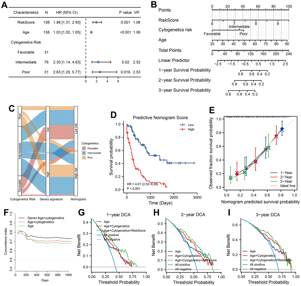 Moreover, plots of C-statistic demonstrated a good discrimination (Figure 7F), with a value of 0.754, 0.741 and 0.731 at 1-, 2- and 3-year, respectively. Compared with the model of age or combined model with age plus cytogenetics risk, higher C-statistic values were seen in predicted nomogram (Figure 7F). With regard to DCA analysis at 1-, 2- and 3-year, various degrees of benefits were presented for nomogram prediction than two other models. Moreover, using the nomogram to predict AML prognosis could add more benefits than either the strategy of intervene-none or intervene-all-patients if the probability is higher than the threshold (Figure 7G–7I).