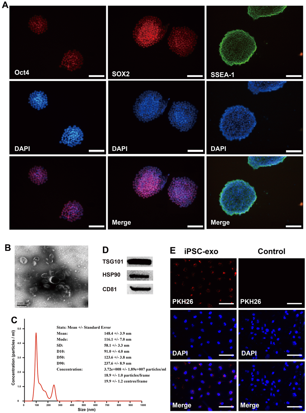 The medium containing KSR was collected daily for exosome purification. iPSCs were fixed in 4% paraformaldehyde at 37° C for 15 min and then incubated with 5% donkey serum and 0.3% Triton X-100 for 60 min. The cells were incubated with the pluripotency markers octamer-binding transcription factor 4 (Oct4), sex-determining region Y-box 2 (SOX2), or Stage-Specific Embryonic Antigen-1 (SSEA-1) (rabbit anti-mouse, 1:1000; Abcam, Cambridge, UK) at 4° C overnight. Thereafter, the cells were washed and incubated with secondary antibodies at 22° C for 60 min, followed by staining with DPAI.