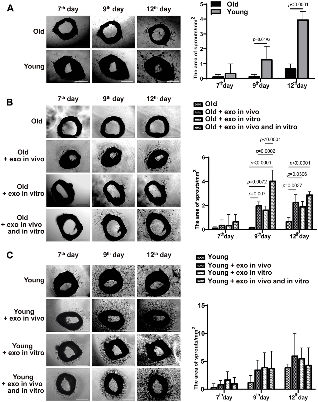The in vitro experiments using aortic rings and nucleated bone marrow from aged and young mice were separately subdivided into four groups. Old mouse group: untreated group (old); in vivo pretreatment with iPSC-exosomes (old + exo in vivo); in vitro culture with iPSC-exosomes (old + exo in vitro); in vivo pretreatment and in vitro culture with iPSC-exosomes (old + exo in vivo and exo in vitro). Young mice: untreated group (young); in vivo pretreatment with iPSC-exosomes group (young + exo in vivo); in vitro culture with iPSC-exosomes group (young + exo in vitro); and in vivo pretreatment and in vitro culture with iPSC-exosomes group (young + exo in vivo and exo in vitro).