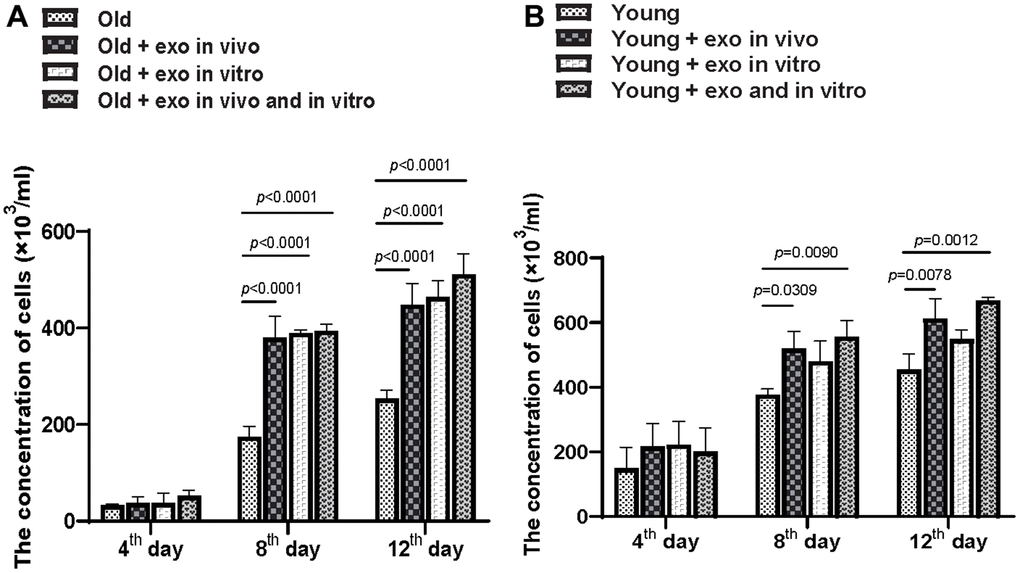 Adherent bone marrow cells were isolated from all mice and cultured, and the number of bone marrow cells in old and young mice was counted. Exosomes treatment increased the clonality of bone marrow cells from aged mice after 12 d regardless of whether the exosomes were cultured in vitro or pre-injected in vivo. Additionally, in vivo or in vitro administration of iPSC-exosomes significantly increased the proliferation of bone marrow cells from aged mice at 8 and 12 d of treatment but not at 4 d (Figure 3A). Compared with the old untreated group, in vitro, in vivo, and in vivo + in vitro treatment significantly increased cell concentrations at 8 and 12 d after treatment. In the case of bone marrow cells from young mice (Figure 3B), in vivo and in vivo + in vitro treatments with exosomes increased clonality at 8 d and 12 d after treatment (Figure 3B). However, in vitro exosome treatment did not significantly affect clonality at 8 or 12 d after treatment.