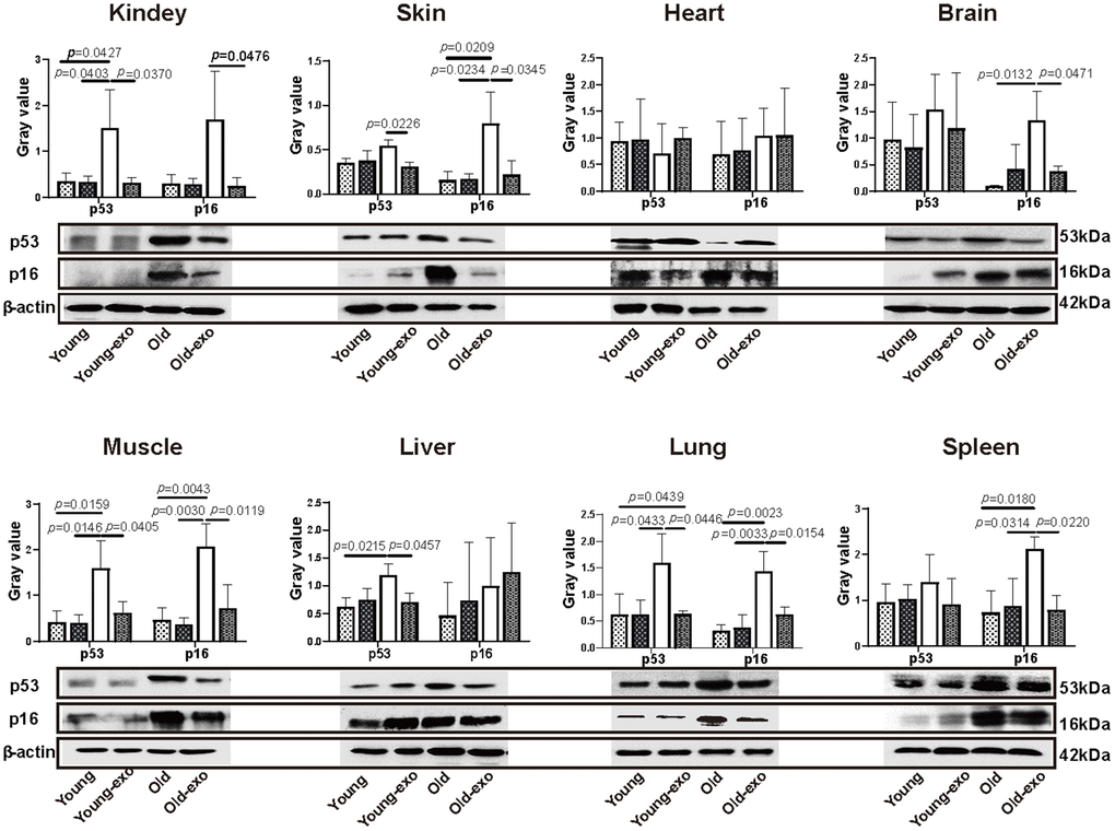 Twelve mice were sacrificed after three months, and skin, muscle, kidney, liver, spleen, lung, heart, and brain tissues were sampled using 1.5 mL tubes and stored in a refrigerator at -80° C. Proteins were extracted from the tissues using radioimmunoprecipitation (RIPA) buffer (Thermo Fisher Scientific, Waltham, MA, USA). Subsequently, the proteins were denatured, resolved on a 12% polyacrylamide gel, and transferred onto a polyvinylidene fluoride membrane (PVDF; Millipore, Bedford, MA, USA). The membranes were incubated overnight with primary antibodies against p53, p16, and β-actin (rabbit anti mouse, 1:1000; Abcam, Cambridge, UK) at 4° C. Thereafter, the PVDF membranes were washed with PBST (Thermo Fisher Scientific, Waltham, MA) three times for 15 min each, and incubated with donkey anti-rabbit (H+L)-peroxidase conjugated secondary antibody (Jackson Laboratory, Bar Harbor, ME, USA) for 1 h at 22° C. Protein bands were visualized using an electrogenerated chemiluminescence ECL (Thermo Fisher Scientific, Waltham, MA) bioluminescence method, and images were obtained using a Tanon image system (Tanon, Beijing, China).