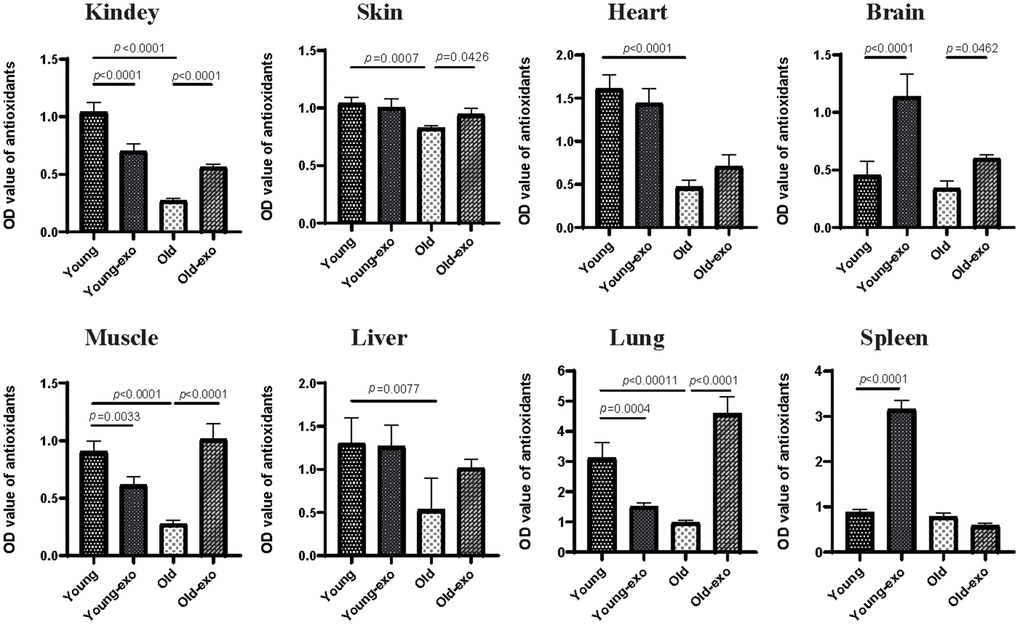 However, the effect of iPSC-exosome on young mice varied among the organs; specifically, the TAOC of the brain and spleen tissues of exosome-treated young mice was significantly higher than those of untreated young mice. In contrast, the TAOC of the kidney, muscle, and lung of exosome-treated young mice was significantly lower than those of untreated young mice; however, there were no significant differences in the TAOC in liver, skin and heart between the groups. Regardless of iPSC-exosome treatment, TAOC was higher in young mice than in untreated old mice (Figure 5).