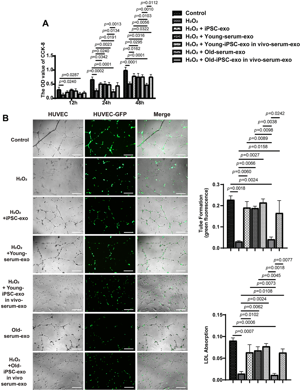HUVEC-GFP were seeded in 24-well plates (1 × 104 cells/well) for 24 h and treated with H2O2, iPSC-derived exosomes, and serum exosomes from iPSC-exosome-treated and untreated mice for an additional 48 h. Thereafter, HUVEC were digested and seeded into 48-well plates (1 × 105 cells/well) that had been pre-coated with 150 μL of Matrigel (10 mg/mL; BD Biosciences, Franklin Lakes, NJ, USA). After incubation for 12 h, capillary-like structures formed by the endothelial cells were observed using an epifluorescence microscope (BX51; Olympus, Tokyo, Japan). Dil-labeled acetylated low-density lipoprotein (Dil-Ac-LD) were used to measured LDL uptake. The fluorescence intensities of Dil were calculated using Image J software.