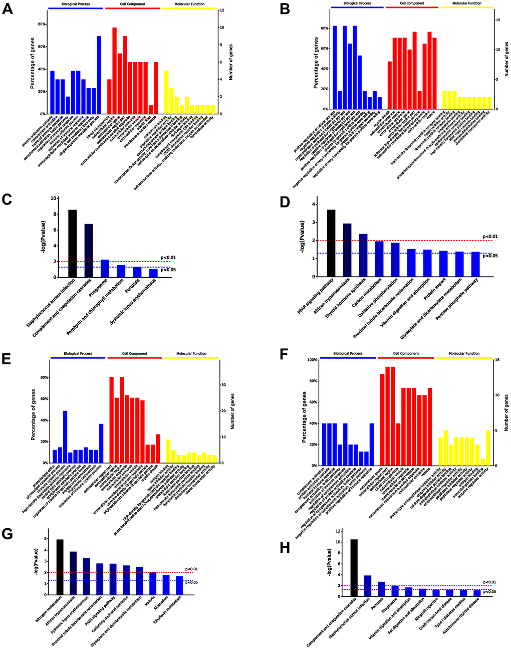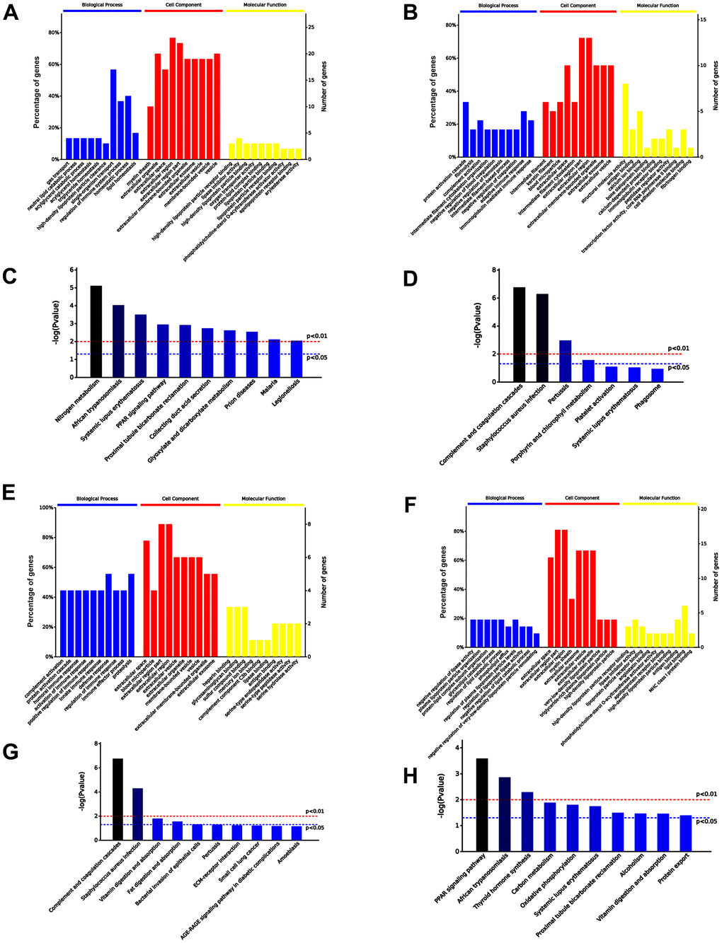 A total 30 proteins were differentially expressed in serum exosomes of untreated aged and young mice, among which 13 proteins were upregulated and 17 downregulated in serum exosomes of untreated aged mice. The top 10 significantly enriched GO terms by the 30 proteins are presented in Figure 7A, 7B. Specifically, the upregulated proteins were enriched in immune response and metabolic process related to higher immune/inflammatory response, while the downregulated proteins were involved in positive regulation of biological process and metabolic process related to increased cell vitality and decreased blood lipid levels in the “Biological Processes” (BP) category. Additionally, the upregulated proteins were enriched in calcium ion binding, while the downregulated proteins were enriched in lipid binding, including high-density lipoprotein particle receptor binding, in the “Molecular Function” (MF) category. Moreover, KEGG analysis revealed that the upregulated proteins were involved in complement and coagulation cascades, while the downregulated proteins were involved in PPAR signaling pathway (Figure 7C, 7D).