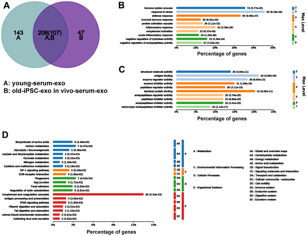 To further demonstrate that serum exosomes of aged mice injected with iPSC-exosomes played a similar role to the serum exosomes of untreated young mice, Venn diagram showed that 208 differentially expressed proteins were common to both groups (Figure 9A). GO functional annotation showed that the proteins were enriched biological processes related to stronger responses to stress and immune/inflammatory injury in the BP category, and in antigen binding and inhibitor activity of key metabolic enzymes in the MF category (Figure 9B, 9C). KEGG signaling pathway showed that proteins were enriched in several pathways related to cellular metabolisms and complement and coagulation cascade (Figure 9D).