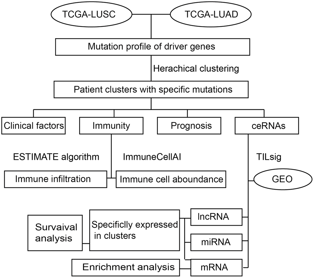 In this study, the transcriptome data and gene mutation profiles of LUAD and LUSC patients were collected from The Cancer Genome Atlas (TCGA) database [11]. With reference to the driver mutations that have been validated in the previous study [12], a hierarchical clustering algorithm was employed to cluster NSCLC patients into subgroups based on driver gene mutation frequencies. Next, survival analysis was applied to investigate the survival risk for NSCLC subgroups. What’s more, we evaluated the immune cell infiltration by using the estimation of stromal and immune cells in malignant tumors using expression data (ESTIMATE) algorithm [13]. The characteristics of the immune microenvironment for each NSCLLC subgroup were estimated by using ImmuneCellAI web tools [14]. Furthermore, we created an immune-related ceRNA signature by using TILsig [15] and validated the efficacy in the GEO dataset. The specific-ceRNAs in NSCLC subgroups were considered as specific markers of the matching NSCLS mutation subgroups. Of course, the survival analysis and function enrichment analysis were also conducted to highlight the role of immune-related ceNRA in NSCLS mutation. The overall design of our study was shown in Figure 1.