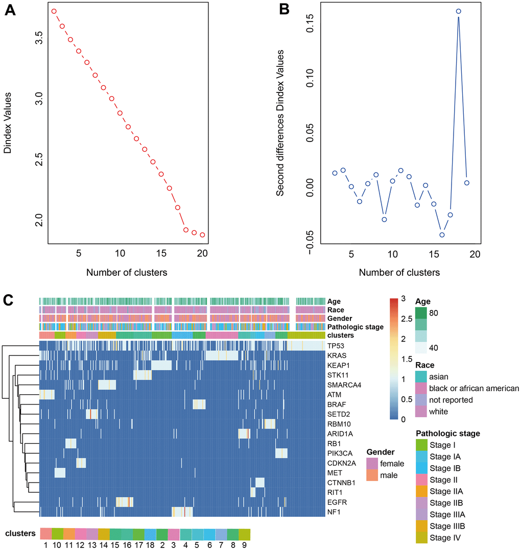 The driver genes of LUSC and LUAD were obtained from the research of Matthew H. Bailey et al. [12] and the driver gene mutation was extracted from the somatic mutation dataset of TCGA. Each gene was counted according to the distribution of mutations in the sample. The frequency matrix of mutations was scaled to calculate the Euclidean distance between samples to produce the distance matrix. Then hierarchical clustering was used to cluster the samples into different groups. The optimal number of clusters was determined with R package Nbclust (3.0.1) [25]. LUSC was clustered into 16 clusters, and LUAD was clustered into 18 clusters.