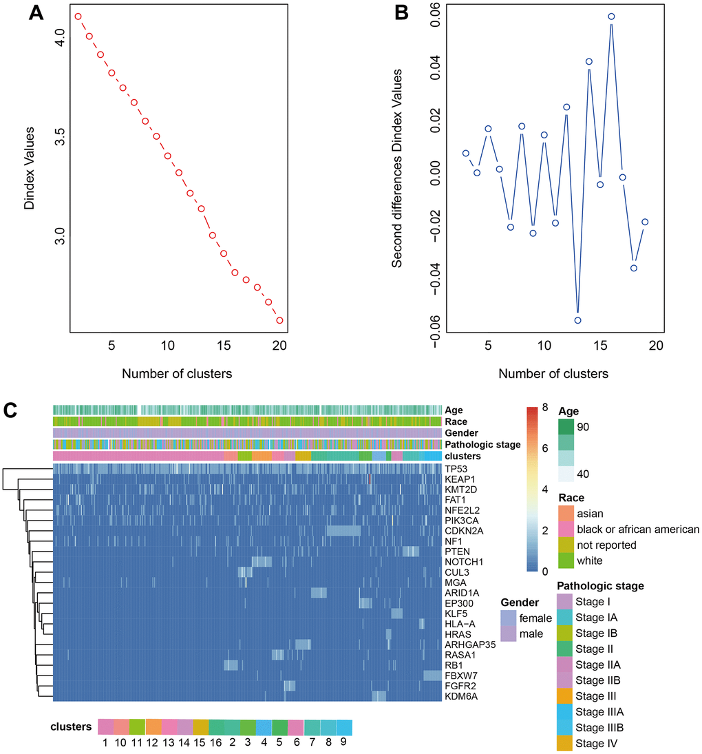 The driver genes of NSCLC were obtained from the research of Matthew H. Bailey et al. [12] and the driver gene mutation was extracted from the somatic mutation dataset downloaded from TCGA. The frequency matrix of mutations was scaled to calculate the Euclidean distance between samples to produce the distance matrix. The optimal number of classes was determined by Nbclust. LUAD was divided into 18 clusters and LUSC was divided into 16 clusters by hierarchical clustering (Figures 2A, 2B, 3A, 3B). The heatmap of cluster analysis was displayed in Figures 2C, 3C. We could acquire each cluster-specific gene mutation. For example, among the 16 groups of LUSC, the mutations of cluster 1 were relatively mixed. RB1 mutation was mostly enrichment in cluster 10. MGA gene and CUL3 mutations were Cluster 11-specific. Compared with LUSC, the clustering effect of LUAD was better. Samples containing TP53 mutation and fewer mutations in other genes were clustered as cluster 9, and the other clusters all contained 1 cluster-specific mutation.