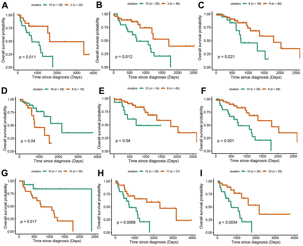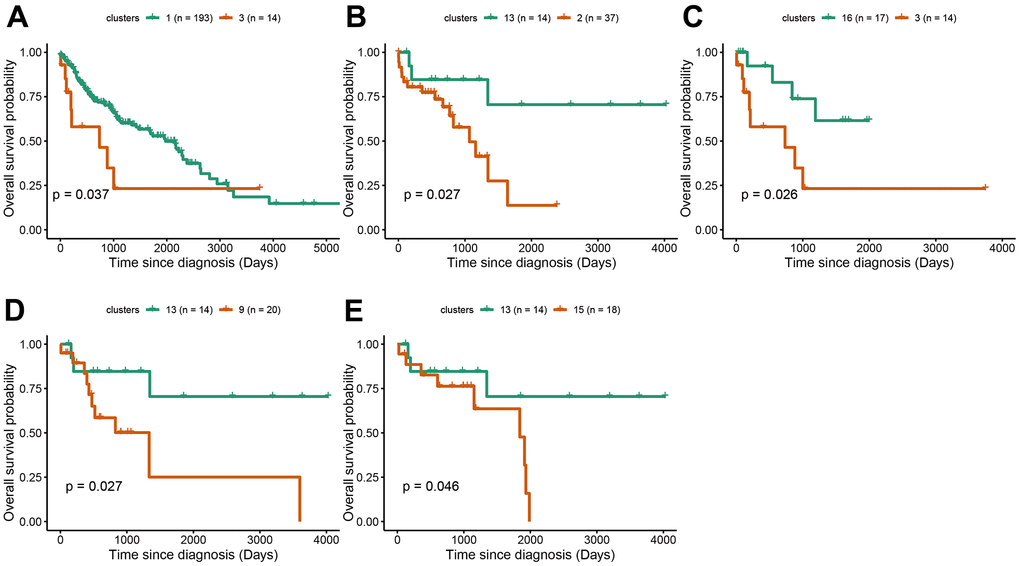 Survival analysis was performed in LUAD and LUSC clusters to examine the influence of cluster-specific gene mutations on NSCLC prognosis. In LUAD, there was a significant survival difference between the following comparisons: cluster1 vs cluster9, cluster5 vs cluster12, cluster6 vs cluster7, cluster7 vs cluster9, cluster8 vs cluster12, cluster9 vs cluster12, cluster14 vs cluster12, cluster17 vs cluster12 (Figure 4A–4H). It was worth noting that cluster9 characterized by TP53 mutation had a better prognosis while cluster12 characterized by CDKN2A mutation, has a poor prognosis. Likewise, in LUSC, we found that there was a significant survival difference between the following comparisons: cluster1 vs cluster3, cluster2 vs cluster13, cluster3 vs cluster16, cluster 9 vs cluster13, and cluster13 vs cluster15 (Figure 5A–5E). We noted that cluster 3 contained EP300 mutation, suggesting that EP300 mutation was positively associated with poor prognosis while cluster 13 characterized by RASA1 mutation showed a good prognosis.