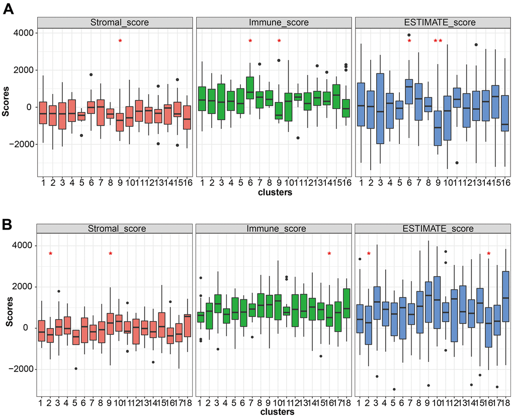 ESTIMATE algorithm, a method that uses gene expression signatures to infer the fraction of stromal and immune cells, was used to detect the inflating scores of tumor and immune cells scores in the tumor environment (https://bioinformatics.mdanderson.org/public-software/estimate/). Stromal cell score, immune cell score, and overall estimate score were calculated by input expression matrix of LUAD and LUSC to the web tool. ImmuCellAI (Immune Cell Abundance Identifier) was used to estimate the abundance of 24 immune cells based on the gene expression dataset including RNA-Seq and microarray data (http://bioinfo.life.hust.edu.cn/ImmuCellAI#!/). The expression profiles of LUSC and LUAD were obtained from TCGA.