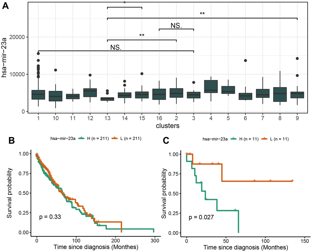 The scores of neutrophil and regulatory T cells of cluster 12 characterized by CDK2NA mutation were significantly lower than in other clusters. This may partly explain the cause of the worse prognosis. In fact, CDKN2A (encoding p16INK4A) exerts a far-reaching tumor-inhibition purpose by enhancing the KRAS signaling pathways activity in accelerating the malignant progression of cancer. The small molecule inhibitors targeting CDK4 and CDK6 recuperate the impaired tumor suppression function induced by p16INK4A mutation, which revives the tumor growth in pancreatic ductal adenocarcinoma (PDAC) [20]. Besides, Kaplan Meier curves of immune-related ceRNAs in LUSC showed that has-miR-23a was not significantly associated with patient survival in the overall samples, but was significantly associated with survival in RASA1 mutation samples, indicating that there may be specific mutations in clusters containing different marker mutations and ceRNA marker molecules.