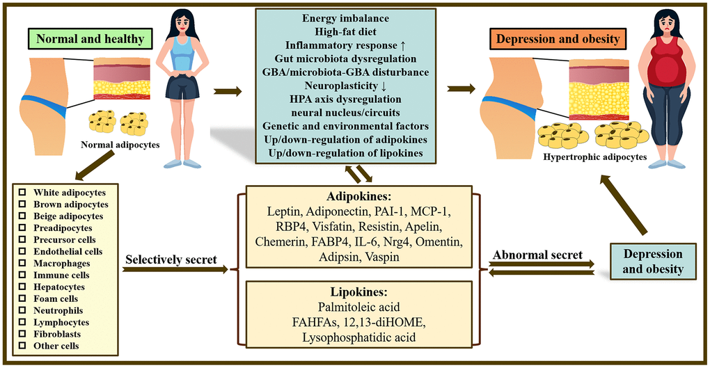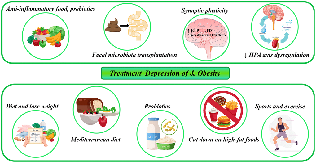 Acute/chronic inflammation, gut microbiota imbalance, gut-brain dysfunction, diminished neuroplasticity and HPA axis dysfunction are common mechanisms in the pathogenesis of depression, and several of these effects often co-occur in depression and also affect obesity at the same time. These factors would potentially provide a biologically based multi-level description of obesity and depression. The characterisation of the mechanisms of action of adipokines and lipokines and the identification of molecular targets of adipokines and lipokines will provide new ideas for this study of the co-morbidities of obesity and depression. Further study of adipokines and lipokines and their interaction with the brain may provide new therapeutic targets for the treatment of depression. Probiotics, herbal extracts and mushroom extracts may be used to prevent and treat the co-morbidities of obesity and depression. Modulation of the gut microbiota may be a novel strategy for the treatment of neuroinflammatory and depressive disorders. FMT may regain clinical attention as a therapy to restore gut flora for the clinical treatment of obesity and depression. The selection and development of treatments tailored to their biology, according to a personalised medicine approach, may ultimately benefit patients with depression and obesity.