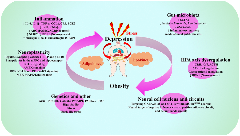 There is ample reason to assume that depression and obesity are interrelated via a vicious, mutually strengthening cycle of negative physiological adaptations. In this section, we review the mechanisms underlying the co-pathogenesis of obesity and depression, mainly around the inflammation, gut microbiota, gut-brain axis (GBA)/microbiota-gut-brain axis (microbiota-GBA), neuroplasticity and HPA axis abnormalities (Figures 1, 2).