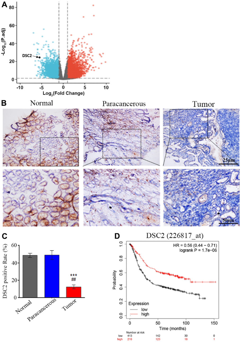 Generally, about 90% of malignant tumor cells originate from the epithelium [4]. Among them, GC is mainly derived from the mucosal epithelial cells of the stomach wall. Desmocollins (DSCs) and Desmogleins (DSGs) are transmembrane proteins belonging to the desmosome cadherin family. Both of them play important roles in maintaining epithelial internal environment stability [5]. Therefore, the abnormal expression of DSCs and DSGs might affect cell differentiation, apoptosis, and proliferation [6]. In normal stomach tissue, only the DSC2 was found to be expressed among DSCs subtypes (including DSC1, DSC2, DSC3) [7]. Khan K et al. reported that colorectal adenocarcinoma patients with decreased expression of DSC2 gene had shorter survival time [4]. Knösel T et al. demonstrated that deficiency of DSC2 promoted the proliferation of colorectal cancer cells [7, 8]. Furthermore, aberrant expression of DSC2 had been reported in a pancreatic ductal adenocarcinoma, oral squamous carcinoma and esophageal squamous cell carcinoma [9–11]. In addition, the level of DSC2 was reported to be negatively correlated with lymph node metastasis and pTNM stages in esophageal squamous cell carcinoma [11]. DSC2 also was reported to inhibit the migration and invasion ability of gastric cancer, lung cancer, squamous cell carcinoma of head and neck [12–14], and so on. Cancer Genome Atlas data demonstrate the critical prognostic role of DSC2 in GC. However, the underlying mechanism by which DSC2 drives the progression of GC is still unclear.