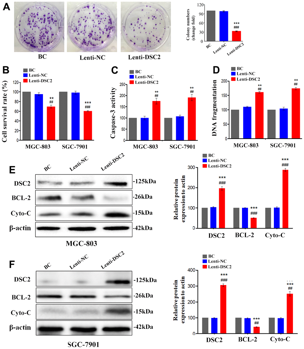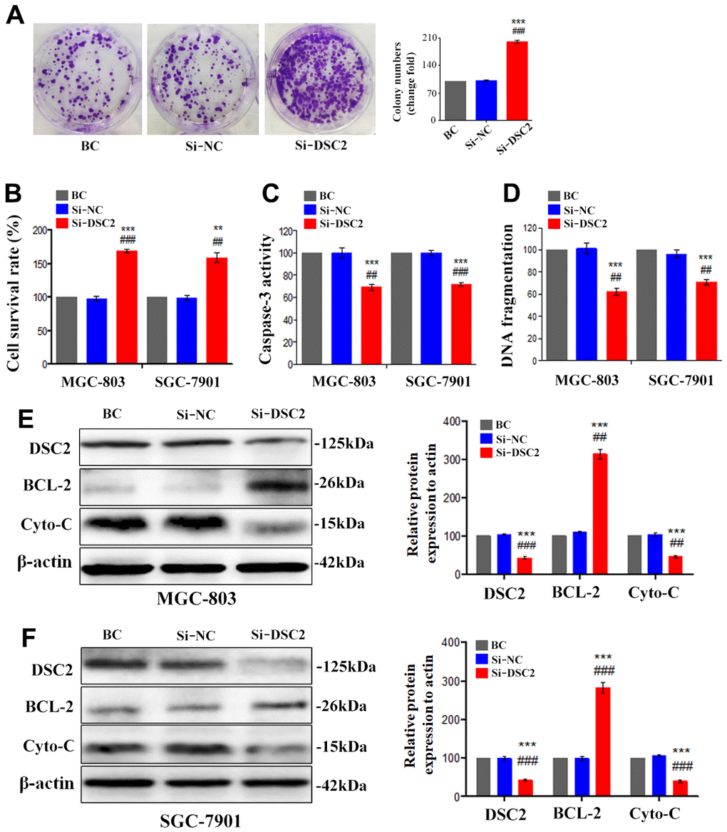We first explored the expression profile of DSC2 in GC patient specimens based on immunohistochemistry. As compared to adjacent normal and paracancerous tissues, DSC2 expression was downregulated in tumors (Figure 1C, 1D). More importantly, volcano plot analysis showed that DSC2 was downregulated in GC tissues than in normal stomach specimens (Figure 1A), and Kaplan-Meier analysis showed that GC patients with high-expression of DSC2 had longer survival time (Figure 1E). Then, we explored the role of DSC2 in the viability of GC cells. Clonal formation, MTT, Caspase-3 activity, and sperm DNA fragmentation assays were used to analyze the role of DSC2 in the viability of GC cells. Overexpression of DSC2 significantly reduced the colony numbers, survival rate of GC cells and correspondingly increased caspase-3 activity and DNA fragmentation level (Figure 2A–2D). Silencing the DSC2 gene had the opposite effect (Figure 3A–3D). Furthermore, suppression of DSC2 resulted in the upregulation in the expression levels of BCL-2 in GC cells, and downregulation in the expression levels of Cyto-C (Figure 3E, 3F). Overexpression of DSC2 had the opposite effects on the expression levels of BCL-2 and Cyto-C in GC cells (Figure 2E, 2F). These data practically demonstrated that DSC2 inhibited the progression of GC, the expression of DSC2 resulted in the inhibition of viability of GC cells, while the downregulation of DSC2 increased the viability of GC cells.