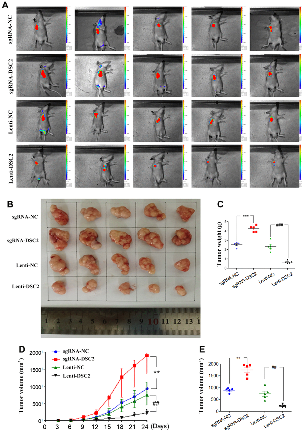 Five-week-old BALB/c nude mice were raised under sterile conditions. All mice were purchased from the Animal Center of China Academy of Medical Science (Beijing, China). All animal experimental procedures conformed to the Institutional Guidelines of Animal Care and Use Committee of Shandong University. The mice were divided randomly into four groups (n = 5 per group): sgRNA-NC group, sgRNA-DSC2 group, lenti-NC group, and Lenti-DSC2 group.