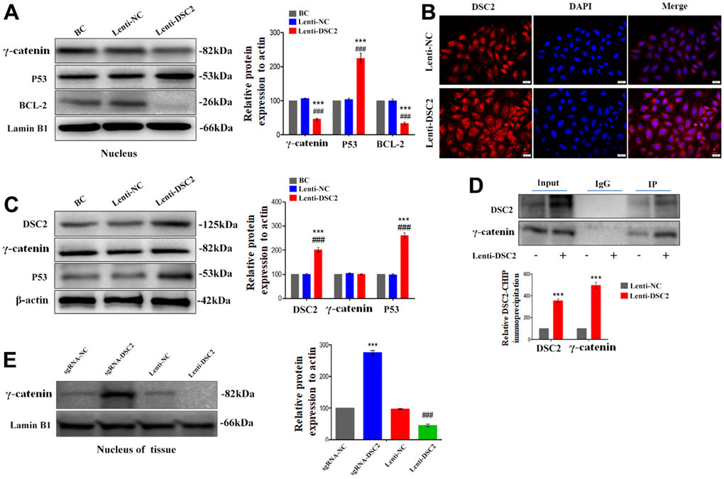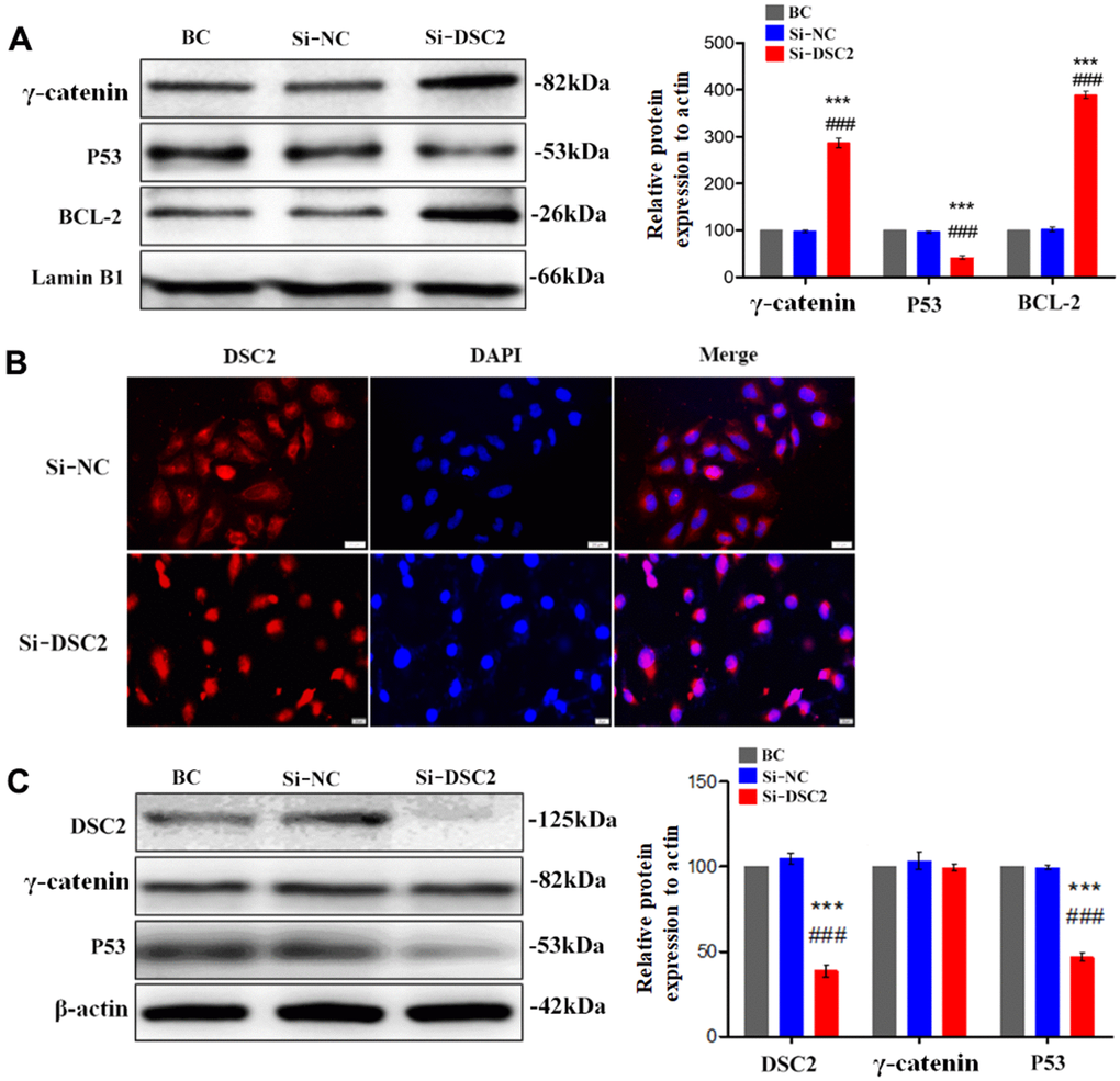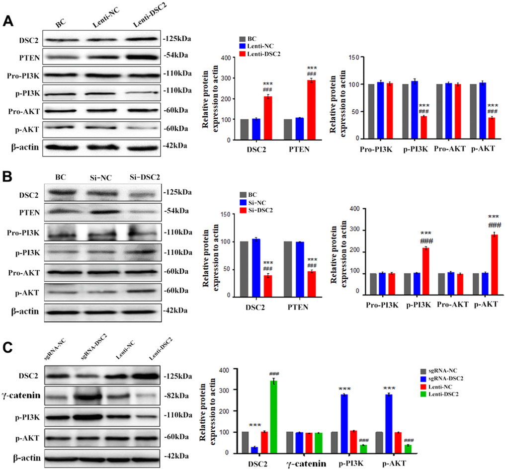 Cells or tissues were lysed in RIPA buffer and protein concentration was determined by BCA protein assay. Nuclear extraction from total lysis was performed using Subcellular Structure Cytoplasmic and Nuclear Extraction Kit. Then, proteins were separated by 10% sodium dodecyl sulfate-polyacrylamide gel electrophoresis (SDS-PAGE). After electrophoresis, the proteins were electrotransferred to PVDF membrane (Millipore, Billerica, USA) and then blocked with 5% non-fat milk for 4 h. The primary antibodies against DSC2 (#53485, Santa Cruz Biotechnology, USA), p-PI3K (#0854, ABclonal Technology, Wuhan, China), PI3K (#4255, Cell Signaling Technology, Massachusetts, USA), p-AKT (#66444, Proteintech, Wuhan, China), Akt (#60203, Proteintech, Wuhan, China), Cyto-C (#4280, Cell Signaling Technology, Massachusetts, USA), caspase-3 (#66470, Proteintech, Wuhan, China), BCL-2 (#12789, Proteintech, Wuhan, China), p53 (#AF0879, Affinity Biotechnology, USA), PTEN (#60300, Proteintech, Wuhan, China), γ-catenin (#66445, Proteintech, Wuhan, China), Lamin B1 (internal reference for the nucleus, #AF5161, Affinity Biotechnology, USA), and β-actin (internal reference for the total cell, #ZF-0313, ZS Bio, Beijing, China) were used.
