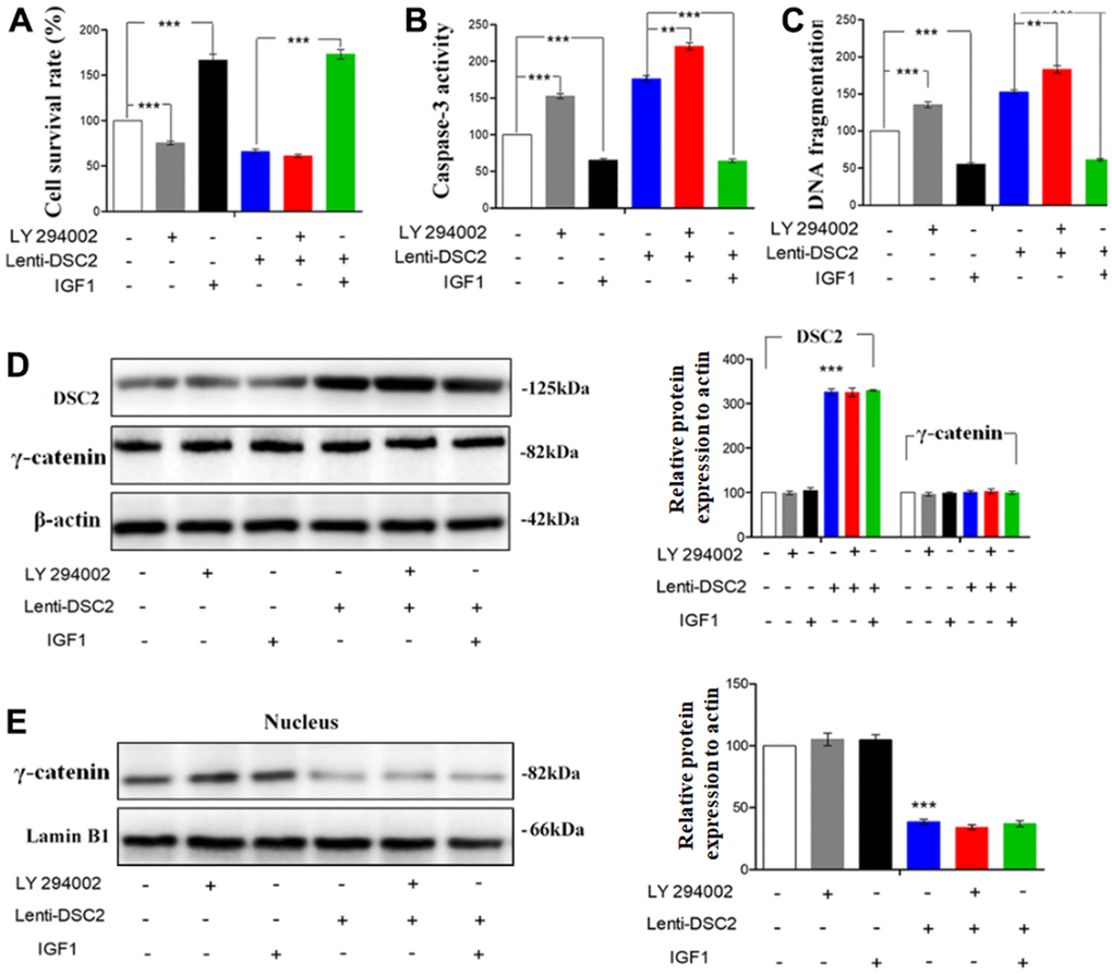 To further investigate the effects of DSC2 on the PI3K/AKT signaling pathway in GC cells, MGC-803 and SGC-7901 cells were pretreated with PI3K inhibitor, LY294002 (30 μM), and its activator, IGF1 (20 μM), for 24 h or 48 h. Then, MTT, Caspase-3 activity, and sperm DNA fragmentation assays were performed. Quantitative data showed that overexpression of DSC2 increased caspase-3 activity and DNA fragmentation levels in GC cells, with the attendant inhibition of cell viability. LY294002 markedly enhanced caspase-3 activity and DNA fragmentation levels in Lenti-DSC2 GC cells. However, IGF1 dramatically reversed the inhibitory effect of DSC2 on the survival rate of Lenti-DSC2 GC cells, accompanied by reversal of the increased caspase-3 activity and DNA fragmentation level in GC cells as induced by DSC2 (Figure 8A–8C and Supplementary Figure 3A–3C). These results demonstrated that PI3K activation reversed the proliferation-inhibiting effects of DSC2 in GC cells. Moreover, neither the PI3K inhibitor nor its activator affected the expression and nuclear translocation of γ-catenin (Figure 8D, 8E, and Supplementary Figure 3D, 3E). These findings suggest that DSC2 inhibited the viability of GC cells via the regulation of the PI3K/AKT signaling pathway. In DSC2-deficient GC cells, the increased nuclear translocation and transcriptional activity of γ-catenin were not related to the PI3K/AKT signaling pathway.