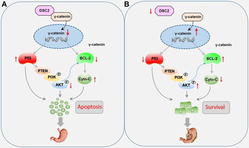 Unfortunately, there were still some limitations in this work. We were unable to find out the specific transcriptional activity inhibitor of γ-catenin. We were not yet able to verify the direct regulatory effect of γ-catenin on the expression of BCL2 and P53. So we just inferred from the experimental results that DSC2 suppressed the nuclear translocation and transcriptional activity of γ-catenin, then inhibited the growth of GC through downregulating the expression of BCL-2 and inhibiting the P53/PTEN/PI3K/AKT signaling pathway, respectively. In the future study, we will continue to search for suitable transcriptional inhibitor of γ-catenin and perform further research.
