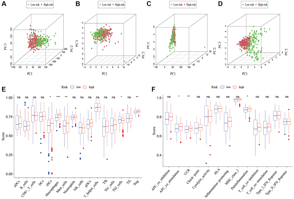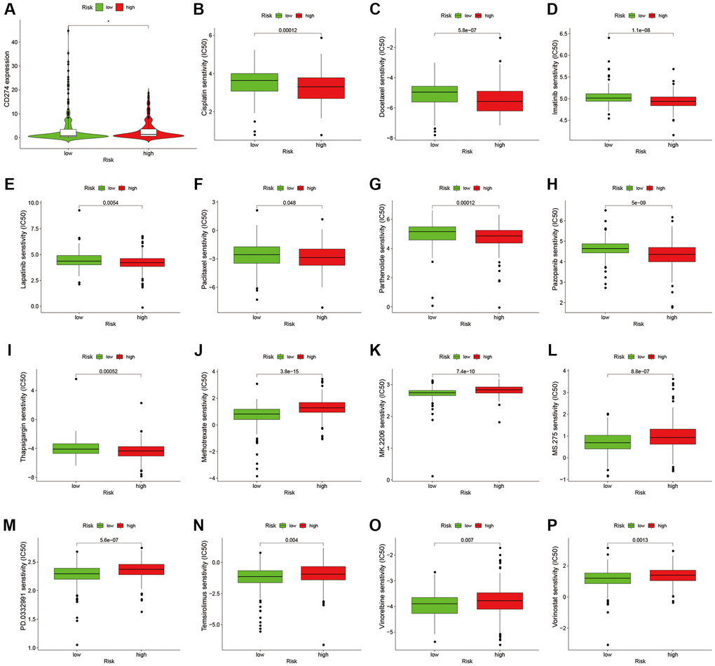 To analyze the level of immune infiltration, we utilized Principal component analysis (PCA) maps that enabled us to visualize patients’ distribution based on their whole genome, cuproptosis-related gene sets, cuproptosis-related lncRNAs, and predictive signature. The results showed that the predictive signature was the best for patients (Figure 9A–9D). Moreover, to investigate the association between risk scores and immune cells and pathways, we calculated the enrichment scores of ssGSEA concerning diverse immune cell subsets and their related pathways. The analysis confirmed the differences of immature dendritic cells (iDCs), macrophages, mast cells, T helper type 2 (Th2) cells, T regulatory cells (Tregs), chemokine receptor (CCR) and parainflammation between two risk groups (Figure 9E, 9F). Given the importance of checkpoint immunotherapy, furthermore observed to differ between two risk groups. When compared to the low-risk group, the high-risk group’s PD−L1 expression was much higher. Results indicated that anti-PD-1/L1 immunotherapy may be effective in high-risk individuals (Figure 10A). Along with immunotherapy, we also analyzed the effect of common drugs on the efficacy of BLCA. The results showed a lower IC50 value of cisplatin, docetaxel, imatinib, lapatinib, paclitaxel, parthenolide, pazopanib and thapsigargin in the high-risk group (Figure 10B–10I), but a higher IC50 value of methotrexate, MK.2206, MS.275, PD.0332991, temsirolimus, vinorelbine and vorinostat in the high-risk group (Figure 10J–10P), which aids in investigating specialized therapy options for BLCA patients in the high-risk and low-risk categories.