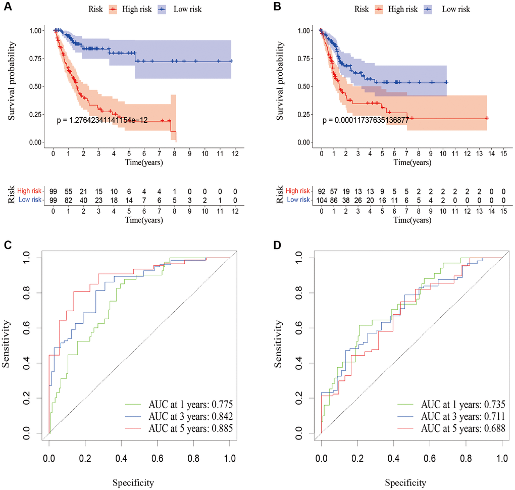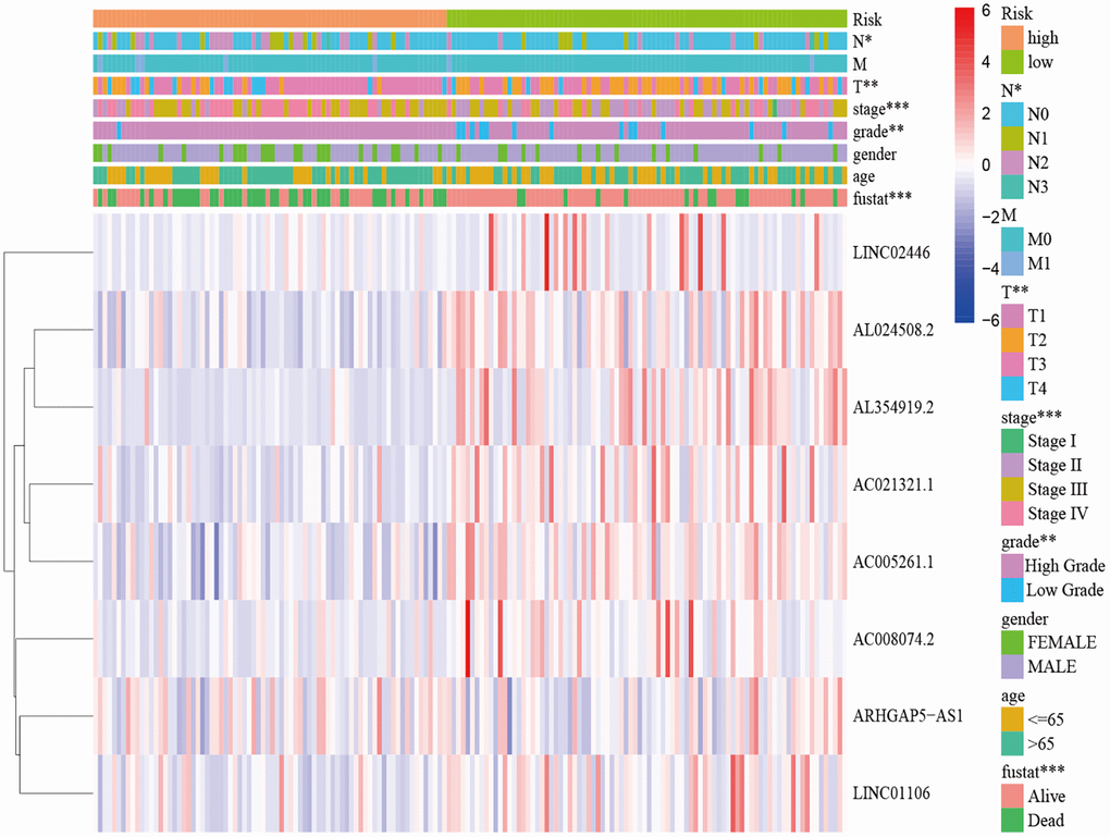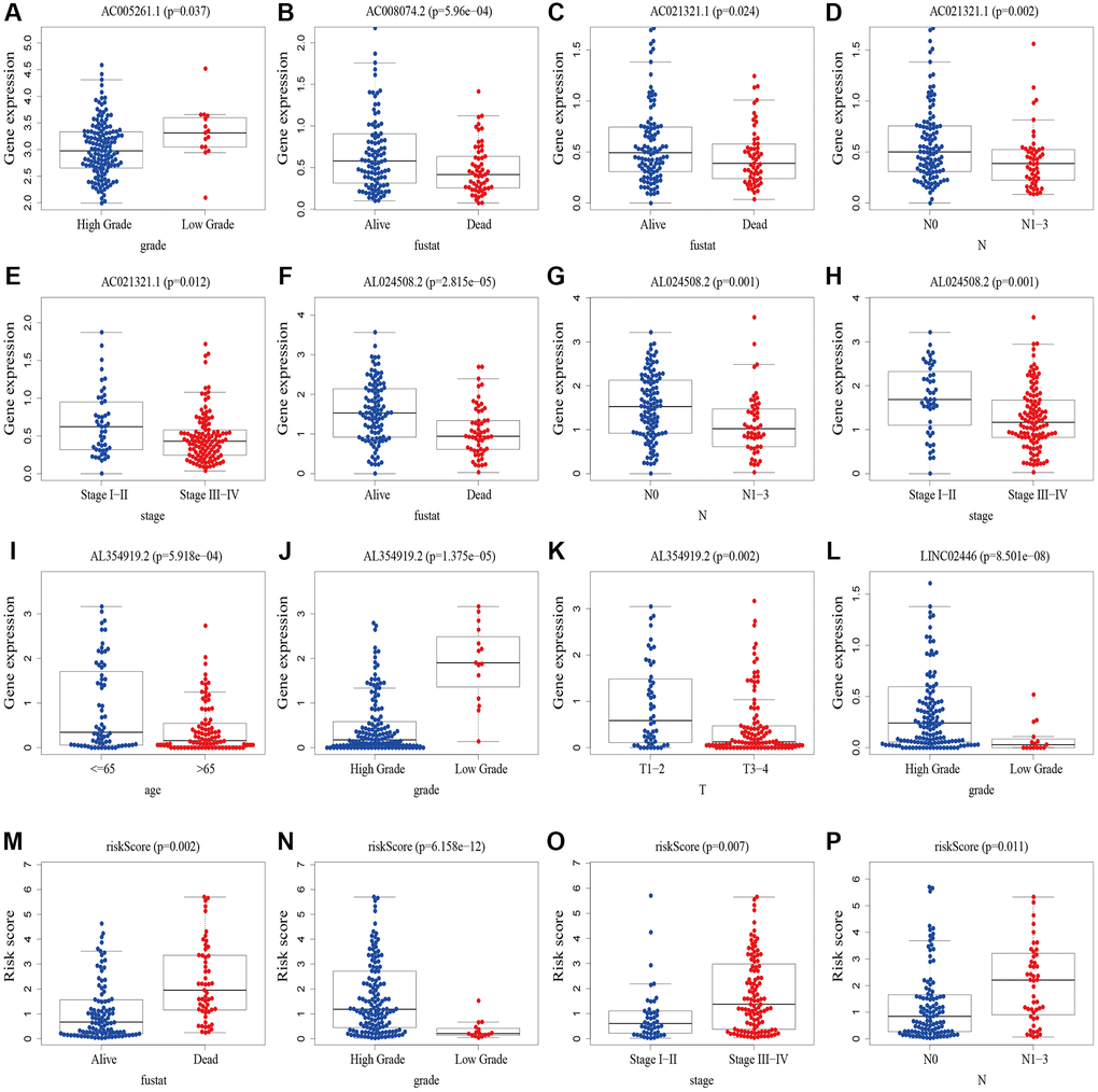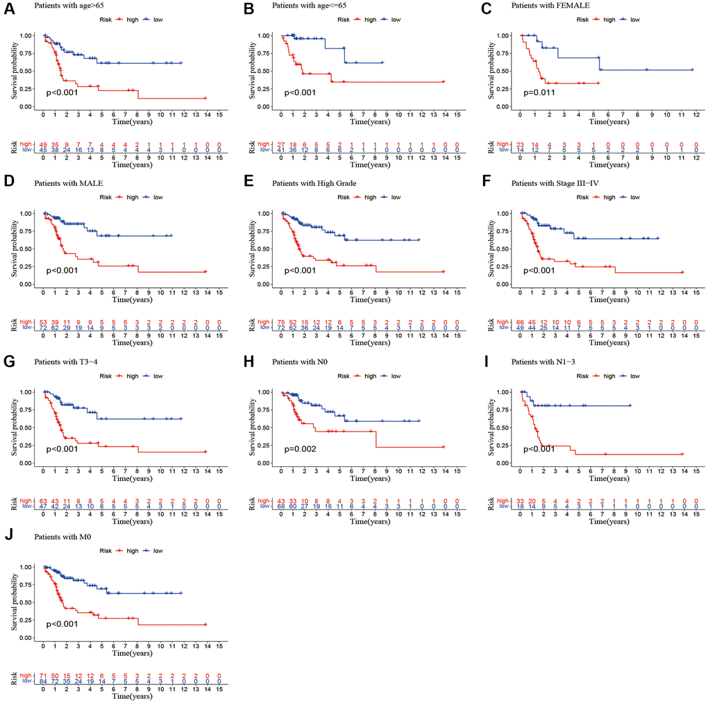 We performed a subgroup analysis of the different age, gender, grade, stage and Tumor Node Metastasis (TNM) stage to study the relationship between the predictive signature and the prognosis of BLCA patients. We found that for the age, gender, high grade, stage III–IV, T3–4 stage, N stage and M0 stage, the OS of BLCA patients in the high-risk group was shorter than that in the low-risk group (Figure 6).