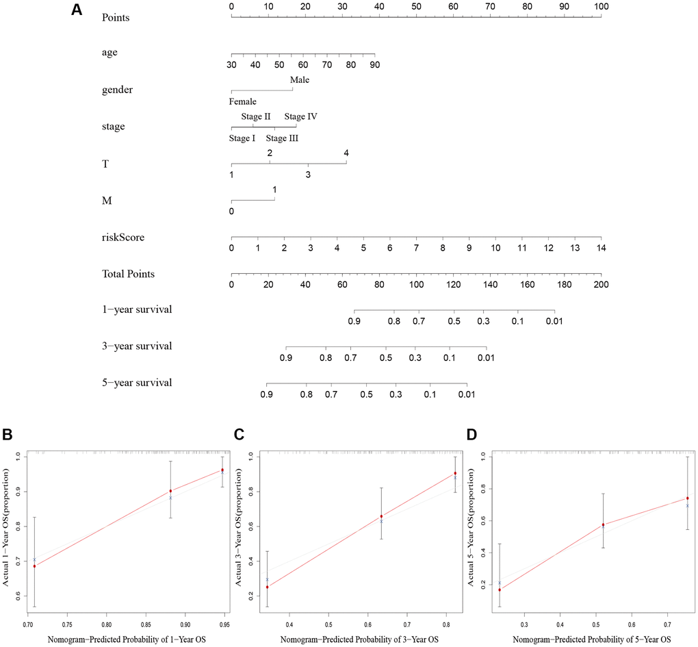 We created a nomogram including clinicopathological factors and risk score to simplify the clinical use of the predictive signature. The nomogram showed that it could help us predict the 1-, 3-, and 5-year survival rates of BLCA (Figure 5A). The calibration curves displayed a strong correlation between the predicted and actual 1-, 3-, and 5-year overall survival rates, as illustrated in Figure 5B–5D.