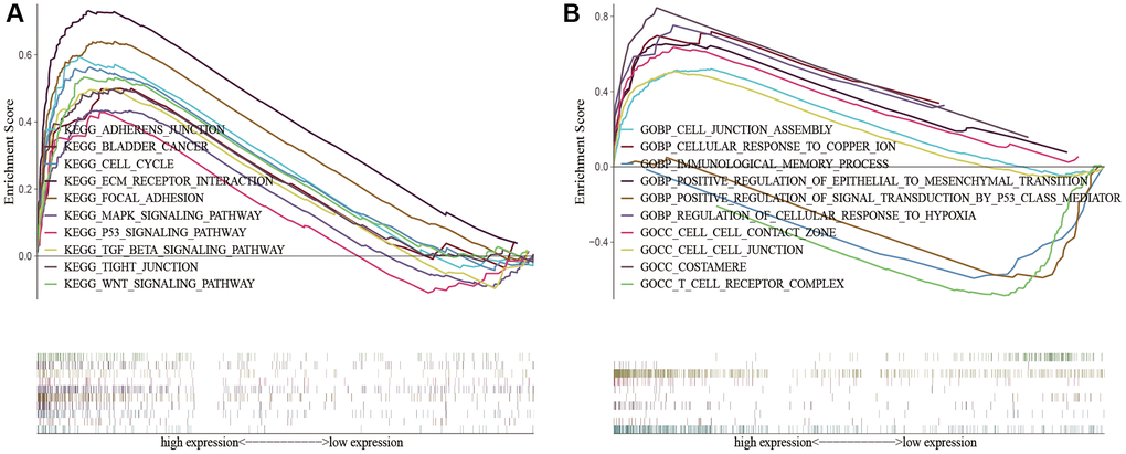 To demonstrate the biological functions and pathways linked with risk score among patients with different risk levels, we conducted a functional enrichment analysis. By performing GSEA on the high-risk and low-risk groups, we were able to detect possible differences between them. As anticipated, we observed significant enrichment of immune-related biological processes and tumor-related signaling pathways in the high-risk group compared to the low-risk group. These pathways included cell cycle, ECM receptor interaction, tight junction, WNT signaling pathway, MAPK signaling pathway, P53 signaling pathway, TGF-beta signaling pathway, cell-cell junction, cellular response to copper ion, immunological memory process, T cell receptor complex, regulation of cellular response to hypoxia, etc. (Figure 8).