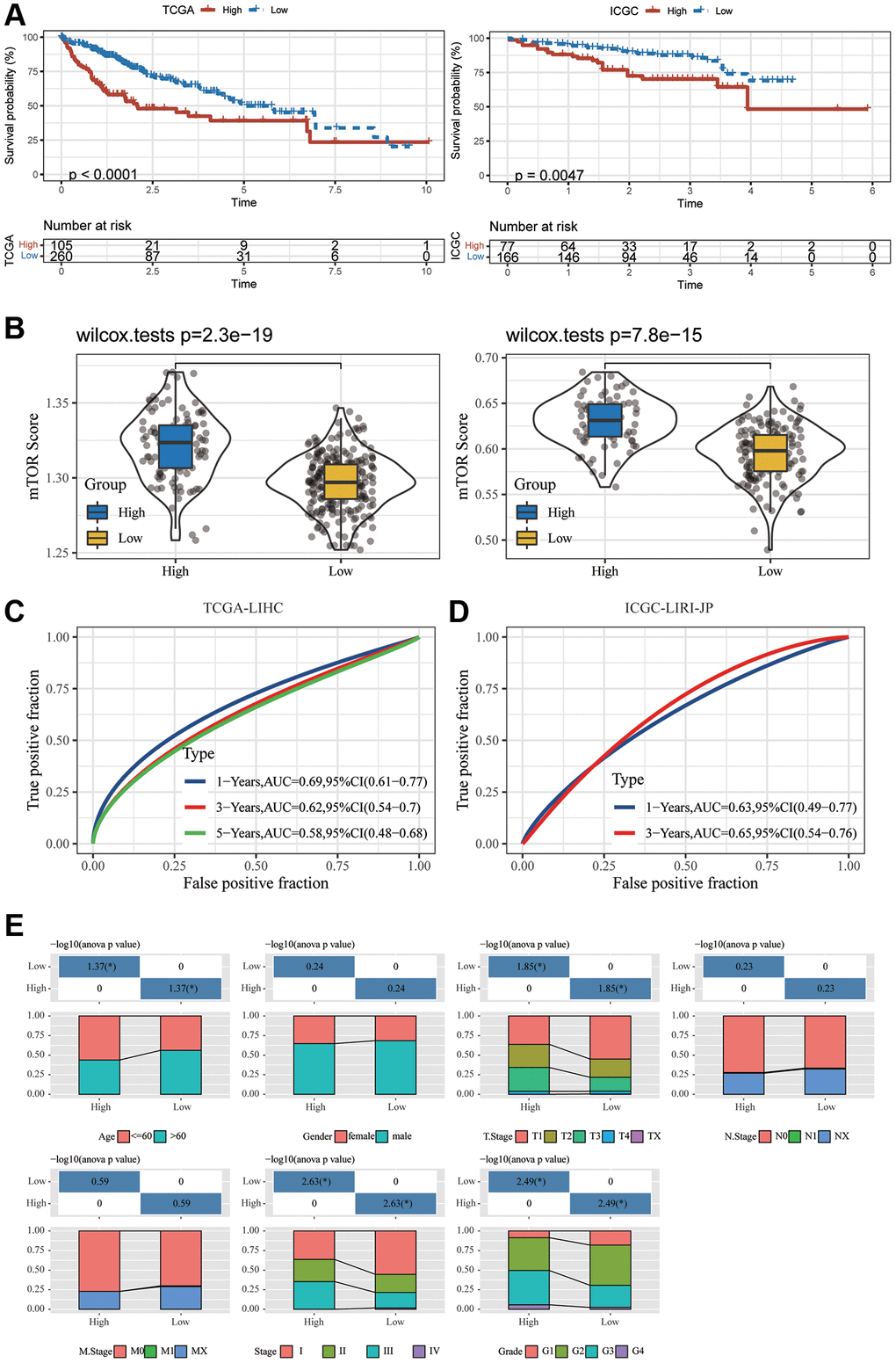 We conducted Cox regression analysis on the key genes identified through the above model screening. Using this analysis, we obtained a hazard ratio (HR) score for each gene. An equation was derived to calculate the risk score for individual patient using the formula as follows: Score = (beta I × Exp i), where beta i is the coefficient of mTORC1 signaling-related genes, and Exp i represent the expression of mTORC1 signaling-related genes. In the TCGA-LIHC cohort, each patient had a risk score on the basis of this signature, and every patient was divided into groups with high- or low-risk utilizing this score, using the threshold as the optimal segmentation point. Kaplan–Meier (K–M) survival analysis and log-rank test were utilized for examining differences (variations) in survival among the patients with high- and low-risk utilizing R statistical analysis software’s “survival” package to further investigate the signature’s prognostic significance. For examining the gene signature’s accuracy in anticipating patient prognosis, time-dependent receiver operating characteristic (ROC) curves were generated utilizing R’s “timeROC” package. Data from the ICGC cohort was used to validate the risk model, allowing for a further assessment of the robustness of the results.