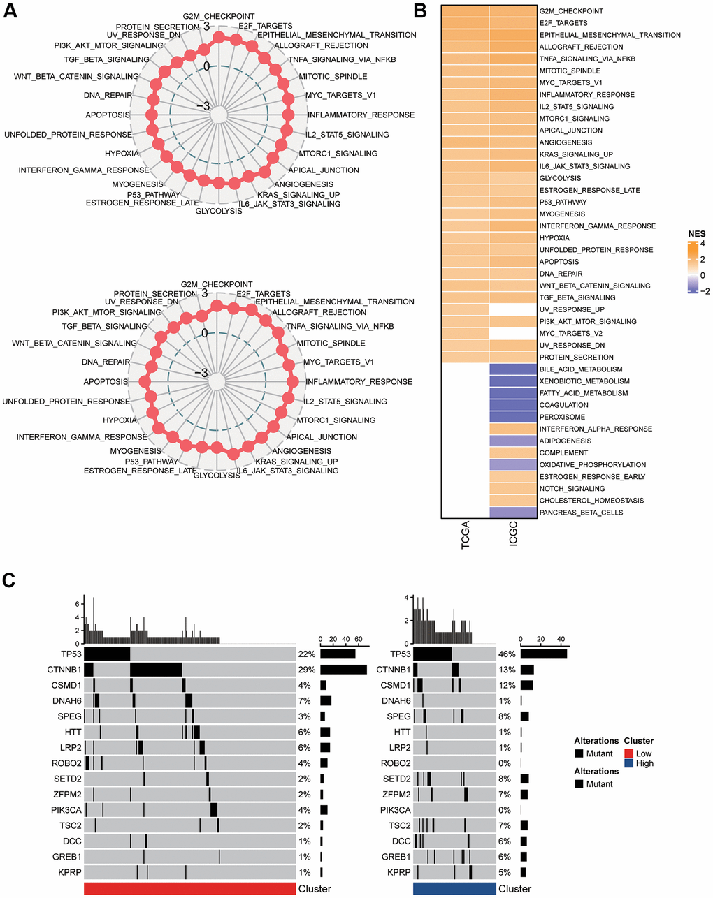 In the two clusters, a differentially expressed gene (DEG) analysis and GSEA were carried out to study the activated cellular signaling pathways that underlie the mTORC1-associated genes. In the TCGA-LIHC dataset, 30 pathways were activated in C2 in comparison with the group with low risk; whereas in the ICGC-LIRI-JP dataset, 8 pathways were inhibited and 33 pathways were activated (Figure 3B). In total, 28 oncogenic pathways, including E2F targets, epithelial mesenchymal transition, G2M checkpoint, allograft rejection, inflammatory response, mitotic spindle, TNFA signaling via NFKB, apical junction, mTORC1 signaling, angiogenesis, glycolysis, estrogen response late, P53 pathway, myogenesis, interferon-gamma response, MYC targets, hypoxia, unfolded protein response, KRAS signaling up, IL-6 JAK STAT3 signaling, apoptosis, IL2 STAT5 signaling, DNA repair, WNT β-Catenin signaling, PI3K-Akt-mTOC signaling, UV response down, protein secretion, and TGF β signaling, overlapped across the two datasets (Figure 3A). Additionally, the differences were statistically substantial across C1 and C2 in terms of the nonsilent mutation rate (Figure 3C). Particularly, in TP53, CTNNB1, and CSMD1. The C1’s mutation burden was lower compared to C2. The mutation rates for TP53 (46% vs. 22%), and CSMD1 (12% vs. 4%), were greater in the C2 patients, while the mutation rate of CTNNB1 (13% vs. 29%) were lower in the C2 patients. Thus, the group with high risk demonstrated a more severe malignancy.