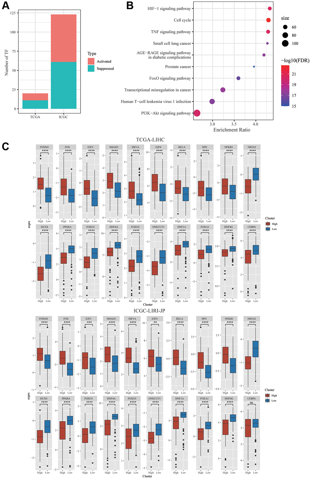 Furthermore, the relationship between dysregulated TFs and mTORC1 scores was investigated. Garcia-Alonso’s approach was employed to compute the TF activity score of individual samples from the ICGC-LIRI-JP and TCGA-LIHC datasets for the comparison of the activity of TF across two clusters. In TCGA-LIHC and ICGC-LIRI-JP cohorts, 9 and 62 substantially activated TFs, respectively, were found in the group with high risk. Furthermore, mTORC1 signaling-related genes and differentially expressed TFs had a substantially negative link among a set of TFs and a group of mTORC1-related genes, according to the analysis of this relationship (Figure 4A). In the TCGA-LIHC dataset, 11 TFs were substantially downregulated and 9 TFs were substantially upregulated in C2 in comparison with C1, whereas in the ICGC-LIRI-JP dataset, 61 TFs were substantially downregulated, whereas 62 TFs were substantially upregulated in C2 in comparison with C1 (Figure 4A). There was speculation that these 20 TFs were a factor in the poor prognosis of patients in the C2 cluster. Analysis of the 20 TFs’ cellular signaling pathway enrichment was carried out to validate this hypothesis. The findings exhibited that a few crucial cancer-related pathways, including TNF signaling pathway, cell cycle, HIF-1Alpha signaling pathway, IL-17 signaling pathway, and PI3K-Akt signaling pathway were considerably enhanced in the TFs’ downstream targets (Figure 4B). Furthermore, in the TCGA dataset, nine TFs’ expression levels were substantially elevated, and the expression levels of eleven TFs were substantially lowered in C2 in comparison with C1 (Figure 4C). Thus, the combination of these mTORC1 signaling-related genes and TFs may facilitate the development of HCC.
