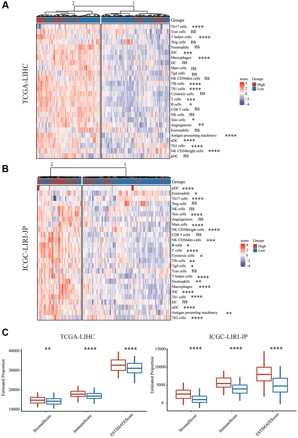 Utilizing immune cell marker gene expression, the level of immune cell infiltration in the HCC cohorts was assessed in order to further investigate the immune microenvironment variations across the two subgroups. Prior studies served as the source for the immune cell marker genes [27]. CD8 T cells are the most important cell type. The CD8 T cells in the two groups did not substantially differ from one another. It was discovered that Th17 cells had a greater abundance in the group with low risk, though T cells, T helper cells, Tfh cells, Th1 cells, and Th2 cells had a greater abundance in the group with high risk (Figure 5A, 5B). Additionally, infiltrating NK cell subtype in the group with high risk was primarily associated with NK CD56 bright cells, while NK cells and NK CD56 dim cells exhibited no significant difference (Figure 5A, 5B). The immune functions between the different risk scores were additionally investigated. Further immunosuppressive properties were discovered in the group with high risk, including aDC, iDC, B cell, and Macrophage. Subsequently, different risk scores’ immune cell composition and correlation were examined. We used an immune score to detect the microenvironment. We utilized the ESTIMATE algorithm for the assessment of the immune score and stromal score of HCC and discovered that the stromal score, immune score, and ESTIMATED score in the group with high risk were substantially elevated in comparison with those in the group with low risk (Figure 5C).
