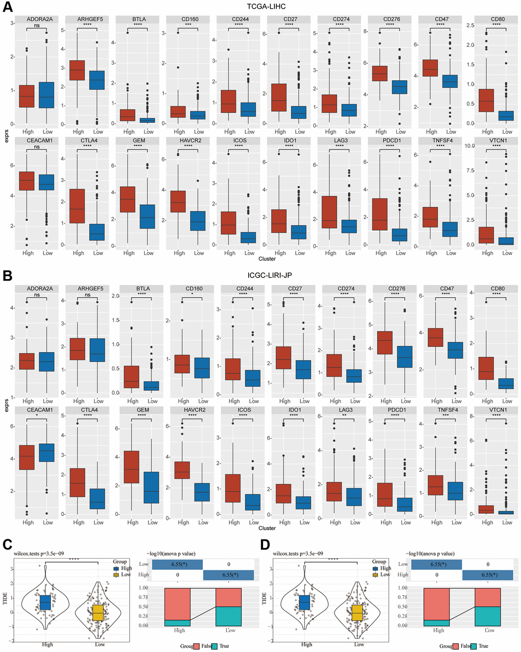 Immune checkpoint genes in the HisgAtalas dataset were examined in light of the immunotherapy’s significance in the treatment of HCC. The findings exhibited that multiple immune checkpoint genes were substantially enhanced in C2 compared to C1. Multiple crucial immune checkpoint genes had elevated levels of expression in the high-risk subgroup of C2, including BTLA, CD27, CD47, CD80, CD160, CD244, CD274, CD276, CTLA4, GEM, HAVCR2, ICOS1, IDO1, LAG3, PDCD1, TNFSF4, and VTCN1 in comparison to those of C1 (Figure 6A, 6B). Furthermore, in the two clusters, the potential response to immunotherapy was evaluated by employing the tumor Immune dysfunction and exclusion (TIDE) software. Immune escape is more likely to occur with a higher TIDE prediction score, which suggests that immunotherapy is less likely to be beneficial for such patients (Figure 6C, 6D). In the TCGA cohort, TIDE scores in C2 were greater compared to those in C1, indicating that patients in C2 may be more susceptible to immune escape and experience fewer immunotherapy benefits (Figure 6C). In the ICGC-LIRI-JP group, a comparable difference was seen in the immunotherapy response’s predictive value (Figure 6D).