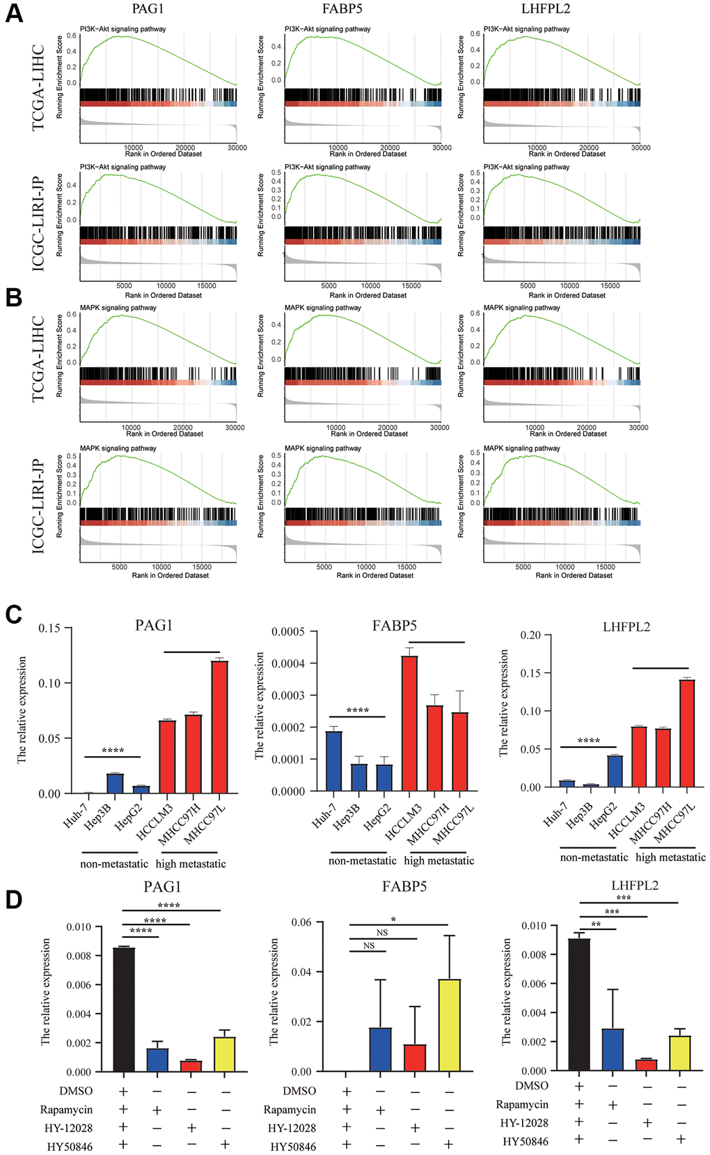 According to GSEA analysis, PI3K-AKT signaling, were primarily enhanced in the high-expression group in TCGA-LIHC and ICGC-LIRI-JP datasets (Figure 7A). Surprisingly, we found that MAPK pathways was significantly correlated with our model (Figure 7B). Additionally, we utilized cell line experiments to further confirm the findings in the database. It was found that the details of the expression of PAG1, LHFPL2, and FABP5 in high HCC metastatic cell lines were substantially greater in comparison with those in HCC non-metastatic cell lines (Figure 7C). Subsequently, following incubation with mTORC1 blocker or MEK/ERK inhibitors for 48 h, the expression of PAG1 and LHFPL2 were significantly downregulated in MHCC97H cell lines, whereas the expression of FABP5 was enhanced in MHCC97H cell lines (Figure 7D).