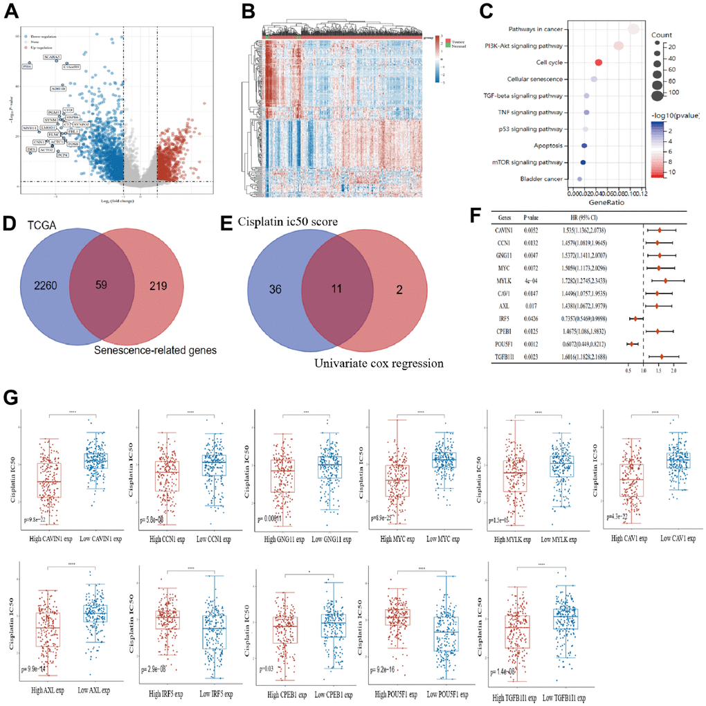 Differential expression analysis was performed on the 406 bladder cancer samples and 19 normal bladder tissue samples in TCGA database. The volcano plot (Figure 1A) and heat map (Figure 1B) show 2319 differential genes, of which 896 were upregulated and 1423 were downregulated. Kyoto Encyclopedia of Genes and Genomes (KEGG) enrichment analysis of the 2319 differential genes showed that they were significantly associated with cellular senescence in bladder cancer (Figure 1C). Based on the online Venn diagram tool, 278 senescence-associated genes downloaded from The Ageing Gene Database website were crosschecked with differential genes to obtain 59 senescence-associated differential genes (Figure 1D). Using these 59 senescence-related differential genes with high and low expression levels as groupings, a total of 47 genes had significant differences in cisplatin IC50 scores and among them, 13 prognostic genes were identified by one-way Cox regression analysis. Eleven senescence-related prognostic differential genes were obtained from the intersection set, and these were significantly associated with cisplatin IC50 scores (Figure 1E). The forest plot (Figure 1F) shows the prognostic characteristics of these 11 genes. Subsequently, we showed the differences in the cisplatin IC50 scores of these 11 key genes for senescence in bladder cancer samples grouped by high and low expression (Figure 1G).