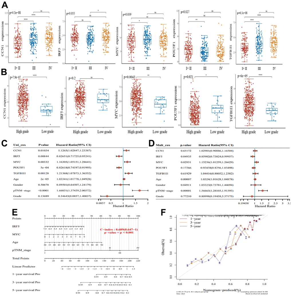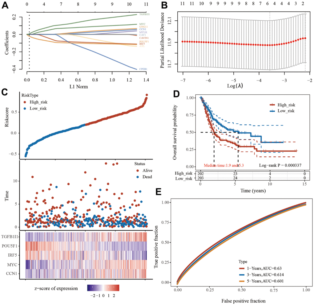 The LASSO regression algorithm was used for feature selection and 10-fold cross-validation, while log rank was used to test Kaplan–Meier survival analysis comparing survival differences between two or more groups, as described above. Time ROC analysis was performed to determine the accuracy of the prediction model. For the Kaplan-Meier curves, p-values and hazard ratios (HR) with 95% confidence intervals (CI) were derived using the log-rank test and univariate Cox regression. Univariate and multivariate Cox regression analyses were performed using the “forestplot” package, and the forest plots showed each variable (p-value, HR and 95% CI). Based on the results of multivariate Cox proportional risk analysis, column line plots were created using the “rms” package to predict the total recurrence rate at 1, 3, and 5 years. The line graphs provide graphical results for these factors and allow calculation of the prognostic risk of individual patients based on the points associated with each risk factor.