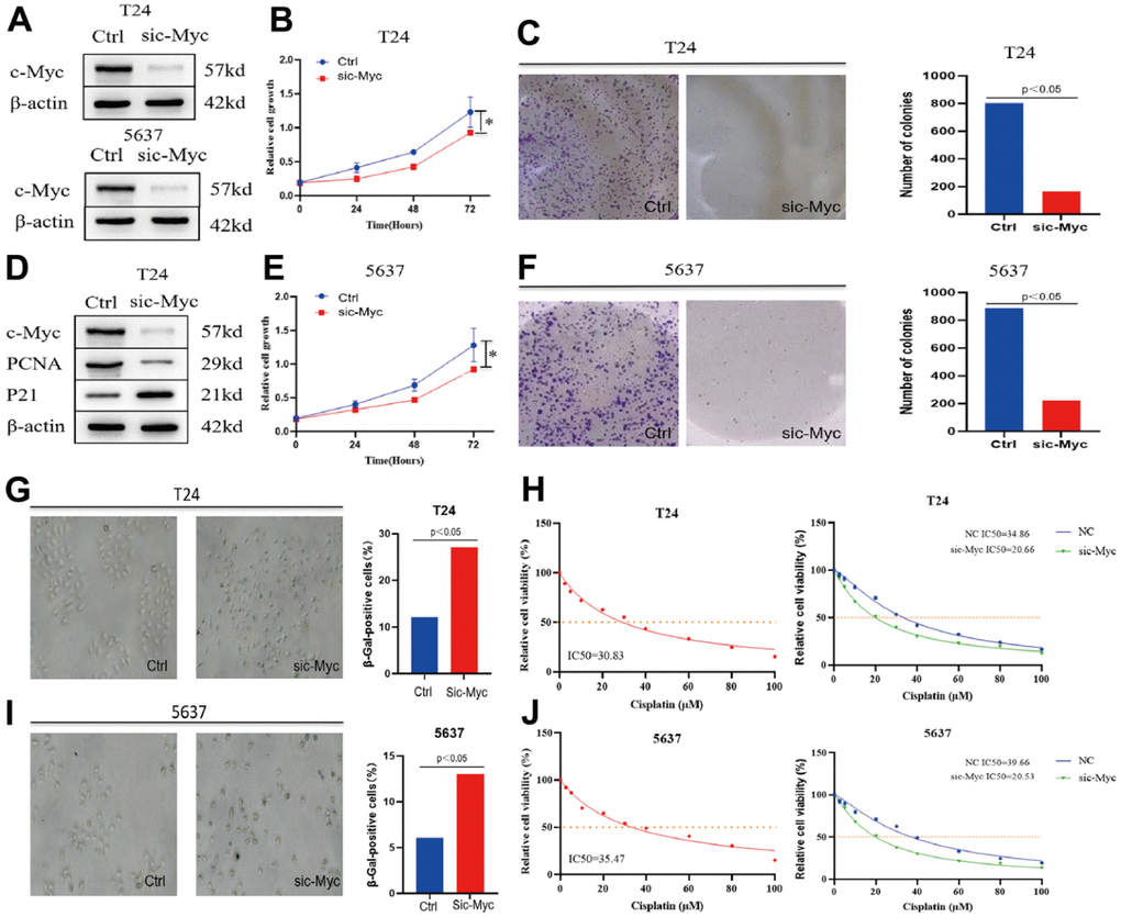 Whether c-Myc regulates bladder cancer cell senescence has not yet been reported. To verify whether c-Myc directly regulates the proliferation of bladder cancer cells, we constructed a c-Myc- knockdown cell model by transfecting bladder cancer cells with c-Myc (Figure 4A). Clonogenic and CCK8 assay was performed to determine the effects of c-Myc on cell proliferation. The results revealed that reduction of c- Myc significantly slowed down cell growth compared to that in the control (Figure 4B, 4C). Microarray-based studies have indicated that p21 expression positively correlates with the expression of genes involved in cellular senescence [17]. Induction of p21 expression by a variety of stimuli is thought to drive senescence initiation [18]. Proliferating cell nuclear antigen (PCNA) is a key factor in DNA replication and cell cycle regulation [19]. In T24 cells, c-Myc increased p21 and decreased PCNA protein expression (Figure 4D). We repeated these experiments in the bladder cancer cell line 5637, and the results also proved that c-Myc can affect the proliferation of bladder cancer cells (Figure 4E, 4F). The level of SA-β-gal (a biomarker of senescence) was measured, and the percentage and strength of SA-β-gal-positive cells were significantly increased in c-Myc knockdown condition (Figure 4G–4I). To test whether c-Myc could influence cisplatin chemosensitivity in 5637 bladder cancer cells, we assayed the corresponding half-lethal dose (IC50) after cisplatin treatment. The IC50 was 30.83 μM in normal T24 cells and 35.47 μM in 5637 cells. We also found that the IC50 of cisplatin was significantly lower after the reduction of c-Myc expression (Figure 4H, 4J). Therefore, we believe that c-Myc regulates cisplatin chemosensitivity by affecting bladder cancer cell senescence.