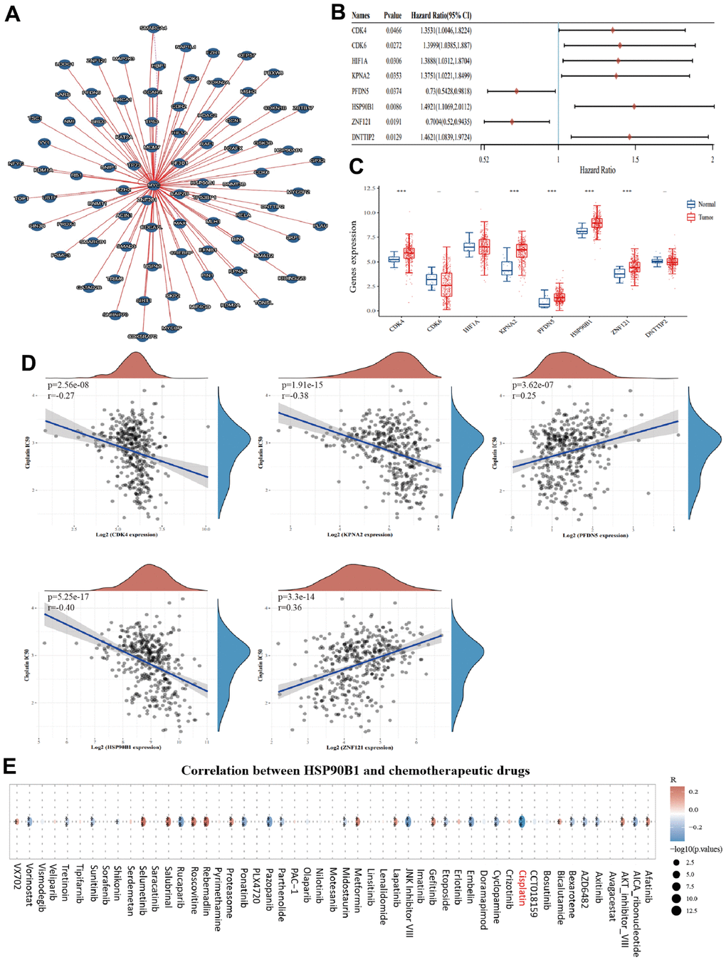 To explore the possible mechanisms by which c-Myc regulates bladder cancer cell senescence, we identified 79 proteins that interacted with c-Myc (direct and indirect evidence of interaction with c-Myc) using the Molecular Interaction Search Tool (MIST) (Supplementary Table 1). As shown in Figure 5A, we mapped the interaction network of c-Myc with other genes. Subsequently, we analyzed the expression and prognostic value of these 79 genes in bladder cancer samples from TCGA database. CDK4, KPNA2, PFDN5, HSP90B1, and ZNF121 were identified as prognostic differential genes in bladder cancer (Figure 5B, 5C). Among these five genes, HSP90B1 was strongly associated with cisplatin chemosensitivity (Figure 5D). Furthermore, to demonstrate the important role of HSP90B1 in bladder cancer chemotherapy, we analyzed the correlation between HSP90B1 and all chemotherapeutic agents in bladder cancer, and the results showed that HSP90B1 was strongly associated with cisplatin (Figure 6E). Thus, among other genes that interact with c-Myc, we suggest that HSP90B1 plays an important role in cisplatin chemotherapy in bladder cancer and may be involved in the regulation of bladder cancer cell senescence by c-Myc.