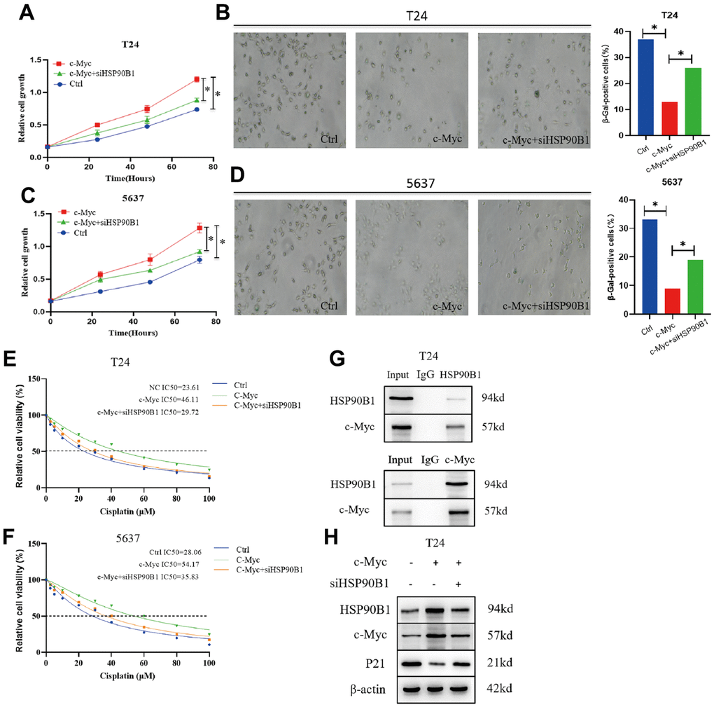 Our findings suggest that c-Myc promotes bladder cancer cell senescence by regulating the p21 signaling pathway to improve cisplatin chemosensitivity. HSP90B1 interacts with c-Myc in bladder cancer and is involved in the regulation of bladder cancer cell senescence by c-Myc. In conclusion, our study provides new insights for improving cisplatin sensitivity in bladder cancer.