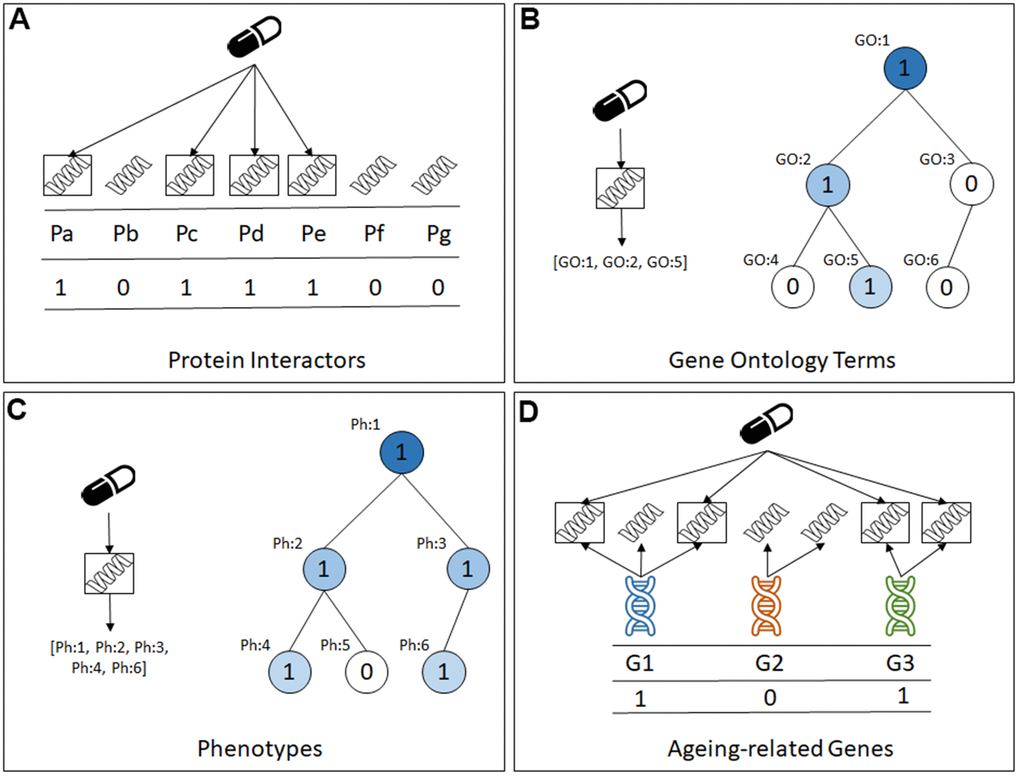 Note that the first feature type, protein interactors, represents a ‘direct’ property of a compound (drug), whilst the latter three feature types represent ‘indirect’ properties of a compound, in the sense that they are associated to the protein interactors and, by extension, to the compounds. To the best of our knowledge, of these four feature types, only GO terms have been used for predicting lifespan-extension compounds with machine learning algorithms [17, 18], and the other three feature types are novel contributions in this context.