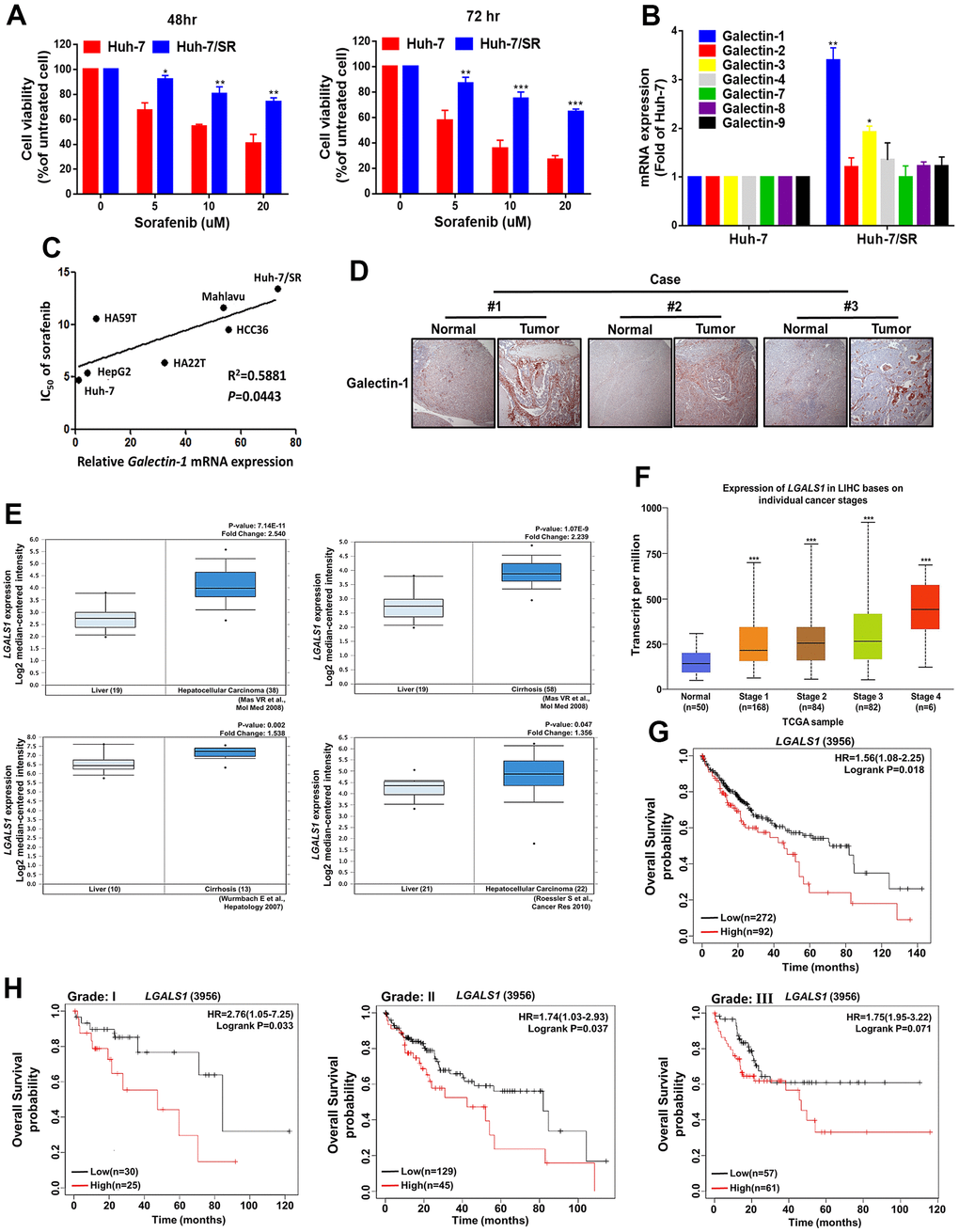 To elucidate the molecular mechanisms underlying sorafenib-mediated drug resistance, we established a sorafenib-resistant HCC cell line (Huh-7/SR) by subjecting Huh-7 cells to stepwise increases in the sorafenib concentration in the culture medium. We examined resistance by using the 3-(4, 5-dimethylthiazol-2-yl)-2, 5-diphenyltetrazolium bromide (MTT) assay. The results indicate that the viability of Huh-7/SR cells was higher than that of parental Huh-7 cells under different sorafenib concentrations (Figure 1A). The galectin family (Galectin-1, -2, -3, -4, -7, -8, and -9) may be associated with cancer progression [30–32]. We compared falectin-1, -2, -3, -4, -7, -8, and -9 mRNA and protein expression levels in Huh-7 and Huh-7/SR cells through quantitative real-time polymerase chain reaction (qRT-PCR) and Western blotting. The mRNA and protein expression of Galectin-1 but not Galectin-2, -3, -4, -7, -8, and -9 were higher in the Huh-7/SR cells (Figure 1B and Supplementary Figure 1). We also analyzed whether Galectin-1 expression is associated with sorafenib sensitivity in different HCC cells (Huh-7, HepG2, HA59T, HA22T, HCC36, Mahlavu, and Huh-7/SR). We observed that Galectin-1 mRNA expression was positively associated with sorafenib resistance in HCC cells (Figure 1C). These findings indicate that Galectin-1 is positively associated with sorafenib resistance and HCC progression. To verify the clinical relevance of our results, we analyzed the association of Galectin-1 with the clinical parameters of patients with liver cancer and observed that Galectin-1 expression was markedly upregulated in liver tissues compared with normal tissues. We examined the Oncomine database and determined that Galectin-1 expression in liver tissues was significantly higher in patients with HCC or cirrhosis than in those without HCC or cirrhosis (Figure 1E). In addition, an analysis of The Cancer Genome Atlas (TCGA) database revealed that Galectin-1 expression was positively correlated with HCC stage (Figure 1F). The overall survival rate of the high Galectin-1 expression group was significantly lower than that of the low Galectin-1 expression group (Figure 1G). In addition, we analyzed the correlation between Galectin-1 expression and overall survival in patients with different HCC tumor grades. The overall survival rate of the high–Galectin-1 expression group was markedly lower than that of the low–Galectin-1 expression group across different HCC tumor grades (Figure 1H). These results indicate that high Galectin-1 expression is correlated with sorafenib resistance and poor prognosis in patients with HCC.