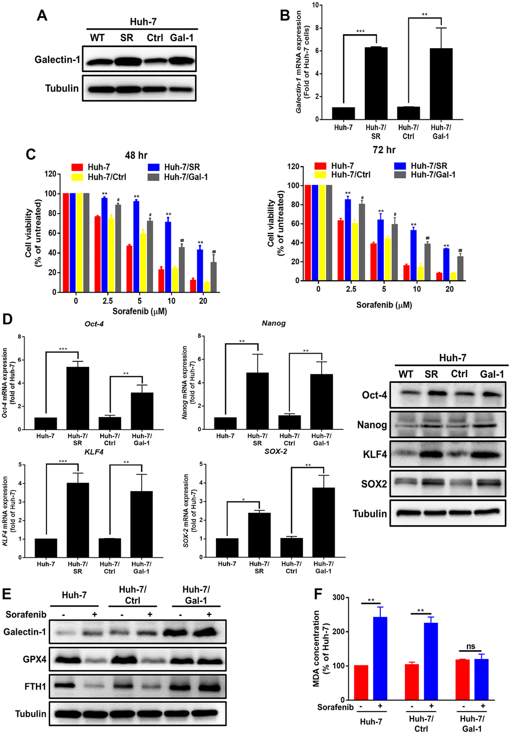 To investigate the effect of Galectin-1 on sorafenib sensitivity and cancer progression in HCC cells, plasmids with Galectin-1 overexpression were transfected into parental Huh-7 cells. Galectin-1 overexpression was verified through Western blotting (Figure 2A) and qRT-PCR (Figure 2B). We performed the MTT assay to determine the effect of Galectin-1 on sorafenib sensitivity. The results demonstrated that Huh-7 cells with Galectin-1 overexpression (Huh-7/Gal) exhibited a significantly lower sorafenib sensitivity than did control-transfected cells (Huh-7/Ctrl; Figure 2C) at 48 and 72 h. We used HepG2 cells to confirm these results and observed that Galectin-1 overexpression in HepG2 cells (HepG2/Gal) significantly increased Galectin-1 mRNA and protein expression (Supplementary Figure 2A, 2B) and enhanced their sorafenib resistance (Supplementary Figure 2C). Cancer stem cells have been linked to therapeutic resistance and tumor recurrence [33, 34]. For this reason, we presumed that Galectin-1 would regulate the cancer stemness of HCC. The results of qRT-PCR and Western blotting indicate that Galectin-1 overexpression increased the mRNA and protein expression of associated stemness-related markers (Oct-4, Nanog, SOX-2, and KLF4; Figure 2D). These data demonstrate that Galectin-1 overexpression reduced sorafenib sensitivity and cancer stemness in HCC cells. Accumulating evidence indicates that sorafenib induces ferroptosis in HCC cells [35–37]. We hypothesized that sorafenib-mediated ferroptosis in HCC would be regulated by Galectin-1 expression. To verify this hypothesis, we examined the expression of the ferroptosis markers GPX4 and FTH1 through Western blotting and discovered that sorafenib reduced GPX4 and FTH1 expression in Huh-7 cells. Subsequently, Galectin-1 overexpression recovered the expression of GPX4 and FTH1 and abolished sorafenib-mediated ferroptosis (Figure 2E). To verify these results, we performed a lipid peroxidation (MDA) assay and determined that Galectin-1 overexpression abolished sorafenib-induced lipid peroxidation (Figure 2F). These data indicate that Galectin-1 overexpression promotes sorafenib resistance and reduces sorafenib-mediated ferroptosis in HCC cells.