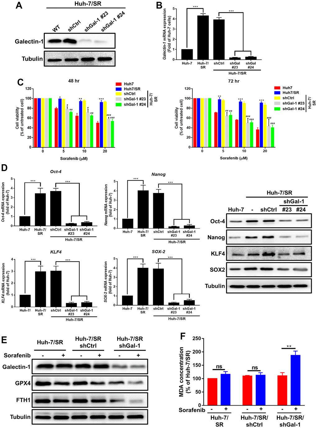 To determine whether Galectin-1 mediates sorafenib sensitivity and ferroptosis activation in HCC cells, we conducted a loss-of-function experiment to verify whether Galectin-1 mediates sorafenib resistance in HCC cells. We transfected Galectin-1 knockdown plasmids into sorafenib-resistant Huh-7/SR cells and examined the transfection efficiency through qRT-PCR and Western blotting. Galectin-1 knockdown in Huh-7/SR cells was achieved through the transfection of Galectin-1 knockdown plasmids (Huh-7/SR/shGal-1 #23 and Huh-7/SR/shGal-1 #24; Figure 3A, 3B). The MTT assay revealed that sorafenib resistance was lower in Huh-7/SR cells with Galectin-1 knockdown (Huh-7/SR/shGal-1 #23 and Huh-7/SR/shGal-1 #24 cells) than in cells without Galectin-1 knockdown (Figure 3C). We performed the same analysis by using Mahlavu cells. The results indicate that Galectin-1 knockdown in Mahlavu cells reduced resistance to sorafenib (Supplementary Figure 3A, 3B). The inhibition of Galectin-1 in Huh-7/SR cells reduced Oct-4, Nanog, SOX-2, and KLF4 protein and mRNA expression (Figure 3D). These results demonstrate that the knockdown of Galectin-1 expression reversed sorafenib resistance and reduced cancer stemness in Huh-7/SR cells. We validated the role of Galectin-1 in sorafenib-mediated ferroptosis and observed that Galectin-1 underexpression inhibited GPX4 and FTH1 expression after sorafenib treatment (Figure 3E). We also examined lipid peroxidation in Huh-7/SR/shGalectin-1 cells and observed a substantial degree of lipid peroxidation in sorafenib-resistant cells with Galectin-1 knockdown (Figure 3F). Collectively, our data demonstrate that the knockdown of Galectin-1 reversed sorafenib resistance, reduced cancer stemness, and enhanced sorafenib-mediated ferroptosis.
