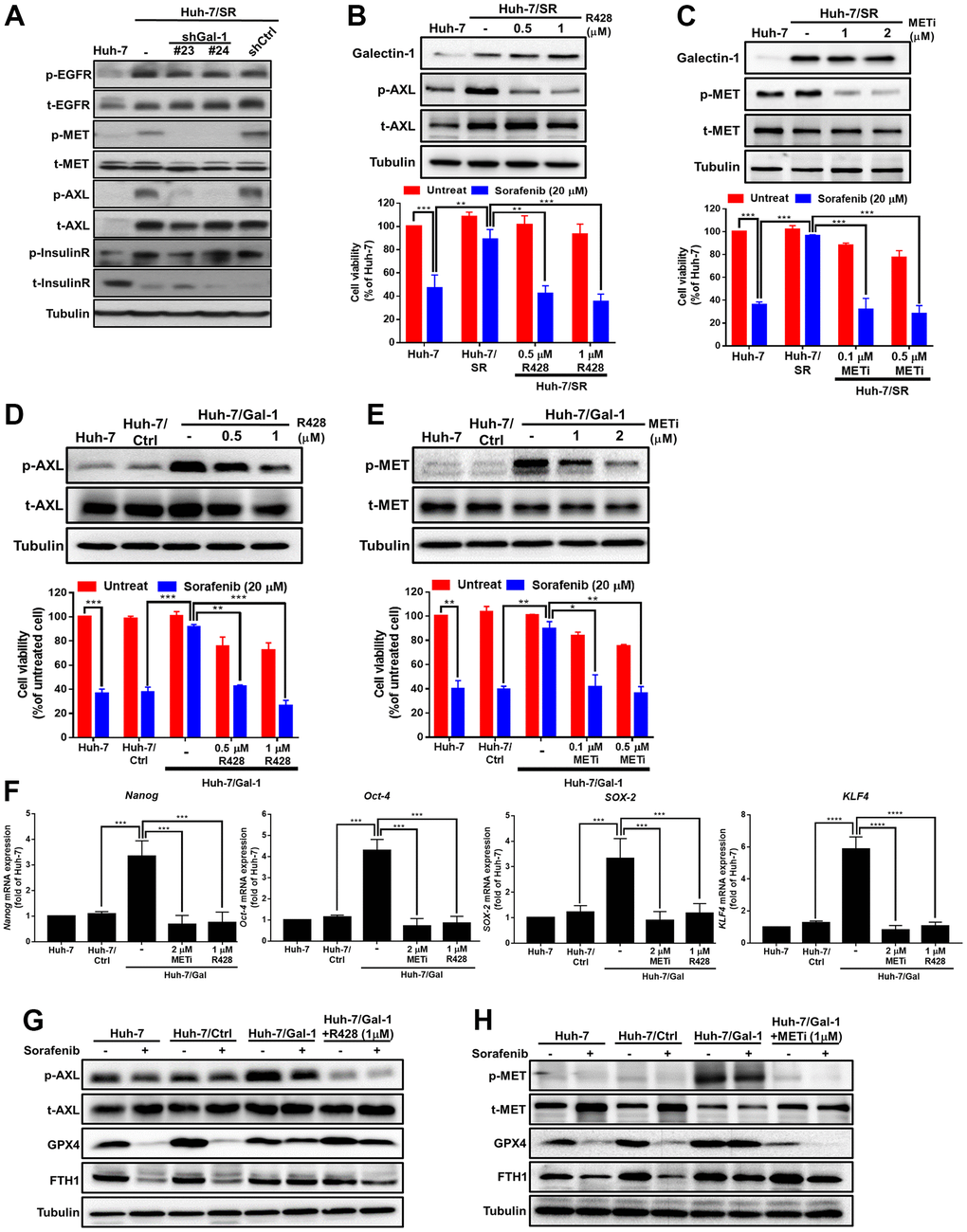 RTKs play a crucial role in drug resistance, and sorafenib is a small-molecule tyrosine kinase inhibitor. Some studies have suggested that epidermal growth factor receptor (EGFR), MET, AXL, and InsulinR are involved in drug resistance mechanisms [38–41]. We hypothesized that RTKs would be involved in the Galectin-1-mediated sensitization of HCC cells to sorafenib. These candidate RTKs were validated, and their differential expression was confirmed through Western blotting. We determined that sorafenib-resistant HCC cells exhibited increased EGFR, MET, AXL, and InsulinR phosphorylation. MET and AXL phosphorylation were significantly lower in Huh-7/SR/shGal-1 cells than in scramble cells, whereas EGFR and InsulinR phosphorylation did not considerably differ between Galectin-1 knockdown Huh7/SR cells and scramble cells (Figure 4A). These results indicate the involvement of AXL and MET in Galectin-1-mediated sorafenib resistance. To investigate whether AXL and MET are involved in the Galectin-1-mediated sorafenib sensitization of HCC cells, we treated Huh-7/SR cells with the AXL inhibitor R428 and the MET inhibitor GSK1363089 and analyzed AXL, MET, and Galectin-1 protein expression through Western blotting. We discovered that treatment with AXL and MET inhibitors successfully inhibited AXL and MET phosphorylation, respectively, but did not affect Galectin-1 expression (Figure 4B, 4C, upper panel). We performed the MTT assay to investigate whether treatment with AXL and MET inhibitors affects the sorafenib-mediated viability of Huh-7/SR cells (Figure 4B, 4C, lower panel). The results indicate that the inhibition of AXL and MET phosphorylation significantly increased the sorafenib sensitivity of Huh-7/SR cells. We next investigated whether AXL and MET are involved in the Galectin-1-mediated sorafenib sensitization of HCC cells. The overexpression of Galectin-1 in Huh-7 cells upregulated the expression of phosphorylated AXL and MET proteins, and treatment with AXL and MET inhibitors reduced the phosphorylation of AXL and MET (Figure 4D, 4E, upper panel). The MTT assay was used to determine whether AXL and MET inhibitors affect Galectin-1-mediated sorafenib resistance. The results demonstrate that the overexpression of Galectin-1 significantly reduced sorafenib sensitivity, whereas the inhibition of AXL and MET phosphorylation reduced resistance to sorafenib (Figure 4D, 4E, lower panel). In addition to using AXL and MET inhibitors, we knocked down AXL and MET. The results indicate that AXL and MET knockdown restored the sorafenib sensitivity of Huh-7 cells under Galectin-1 overexpression (Supplementary Figure 4A, 4B). Treatment with AXL and MET inhibitors successfully abolished Galectin-1 overexpression–mediated cancer stemness (Figure 4F). We investigated the effect of AXL and MET inhibition on the role of Galectin-1 in mediating sorafenib sensitivity and sorafenib-mediated ferroptosis. Western blot analysis revealed that GPX4 and FTH1 expression was lower in Galectin-1-overexpressing cells after cotreatment with an AXL inhibitor (Figure 4G) or an MET inhibitor (Figure 4H) and sorafenib. These results indicate the involvement of AXL and MET in Galectin-1-mediated sorafenib resistance and sorafenib-mediated ferroptosis in HCC cells.